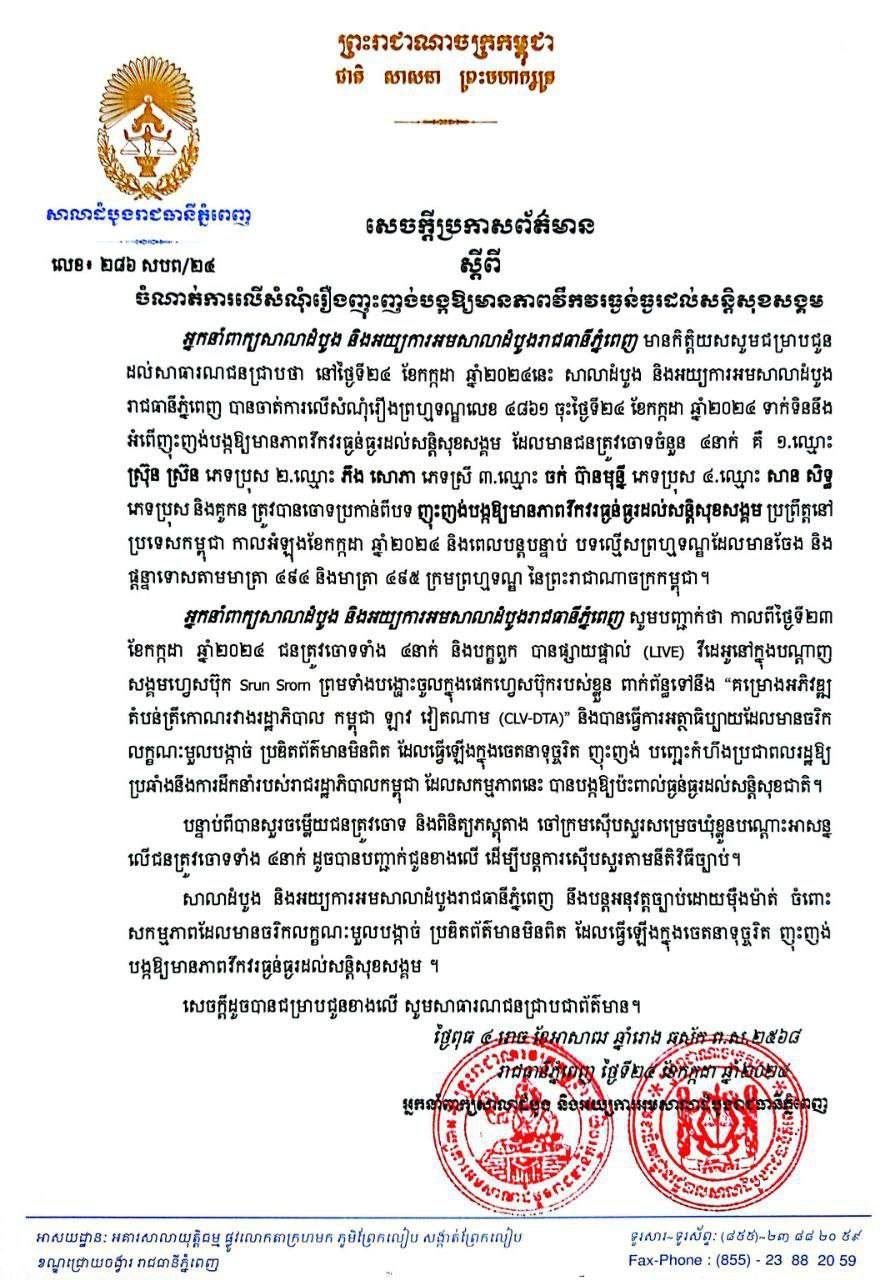 អ្នកនាំពាក្យសាលាដំបូង និងអយ្យការអមសាលាដំបូងរាជធានីភ្នំពេញ សូមបញ្ជាក់ថា កាលពីថ្ងៃទី២៣ ខែកក្កដា ឆ្នាំ២០២៤ ជនត្រូវចោទទាំង ៤នាក់ និងបក្ខពួក បានផ្សាយផ្ទាល់ (LIVE) វីដេអូនៅក្នុងបណ្តាញសង្គមហ្វេសប៊ុក Srun Srorm ព្រមទាំងបង្ហោះចូលក្នុងផេកហ្វេសប៊ុករបស់ខ្លួន ពាក់ព័ន្ធទៅនឹង “គម្រោងអភិវឌ្ឍតំបន់ត្រីកោណរវាងរដ្ឋាភិបាល កម្ពុជា ឡាវ វៀតណាម (CLV-DTA)” និងបានធ្វើការអត្ថាធិប្បាយដែលមានចរិក លក្ខណៈមួលបង្កាច់ ប្រឌិតព័ត៌មានមិនពិត ដែលធ្វើឡើងក្នុងចេតនាទុច្ចរិត ញុះញង់ បញ្ចុះកំហឹងប្រជាពលរដ្ឋឱ្យ ប្រឆាំងនឹងការដឹកនាំរបស់រាជរដ្ឋាភិបាលកម្ពុជា ដែលសកម្មភាពនេះ បានបង្កឱ្យប៉ះពាល់ធ្ងន់ធ្ងរដល់សន្តិសុខជាតិ។