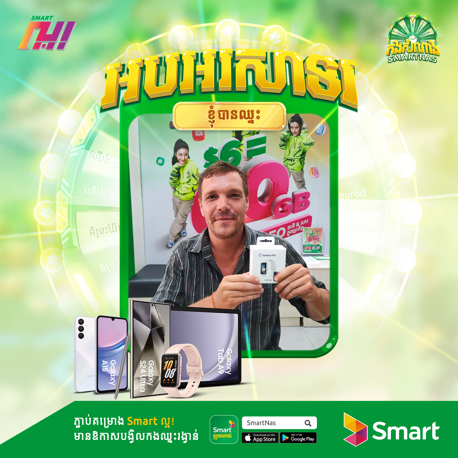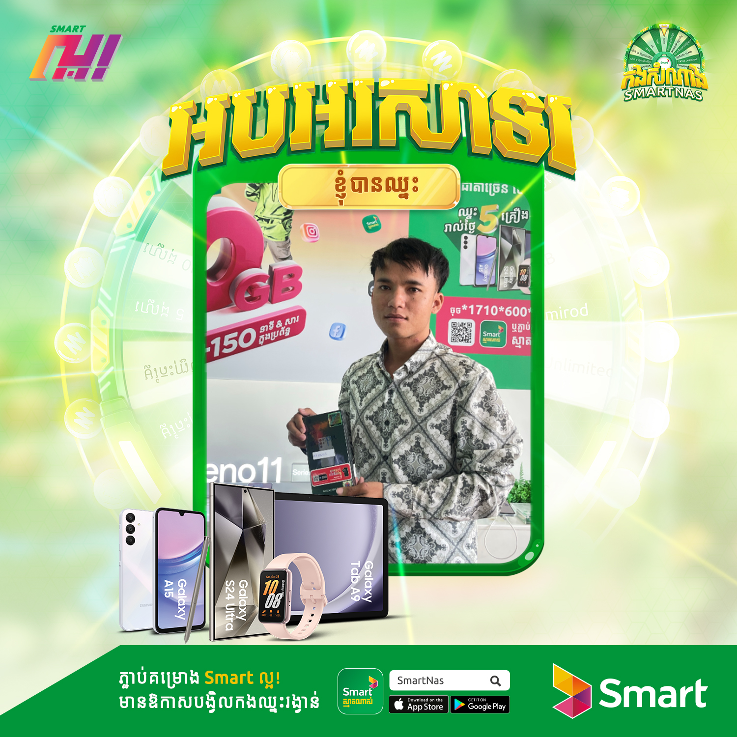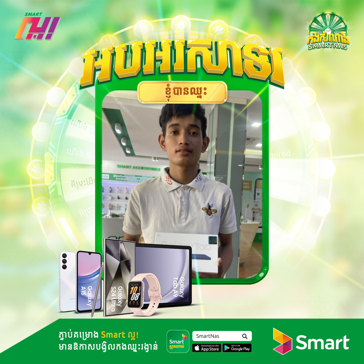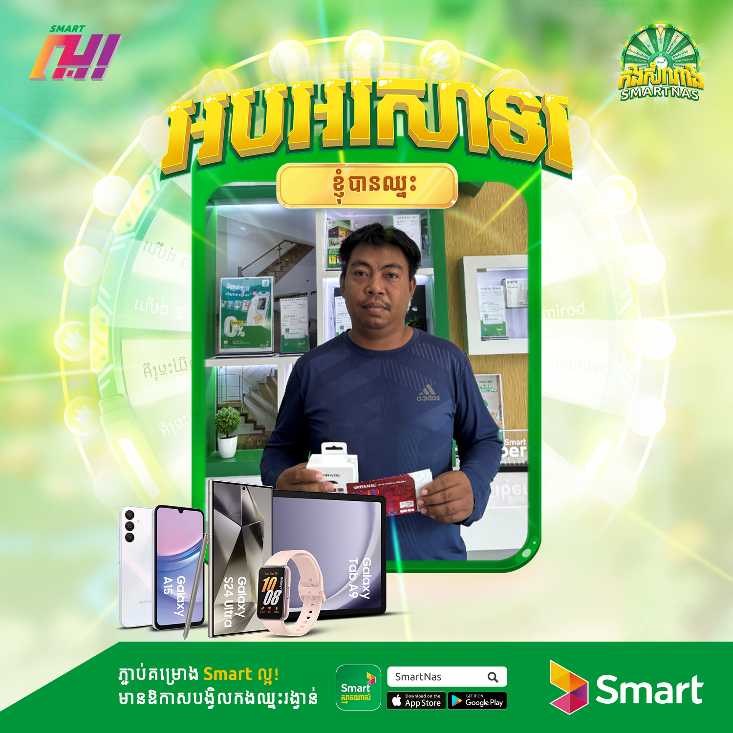 គួរបញ្ជាក់ផងដែរថា សម្រាប់ការឈ្នះរង្វាន់គឺធ្វើឡើងប្រកបដោយតម្លាភាព និងឈ្នះ្នះដោយពិតប្រាកដ ។ ជាក់ស្តែង Smart បាននិងកំពុងតែបន្តផ្តល់ជូនរង្វាន់ទៅកាន់អតិថិជនជាបន្តបន្ទាប់ជាច្រើនរូប ដែលបានភ្ជាប់គម្រោង Smart ល្អ! ហើយបង្វិលកងសំណាង SmartNas។ ខាងក្រោមនេះជារូបភាព អតិថិជនមួយចំនួនដែលបានឈ្នះនាពេលកន្លងមក។