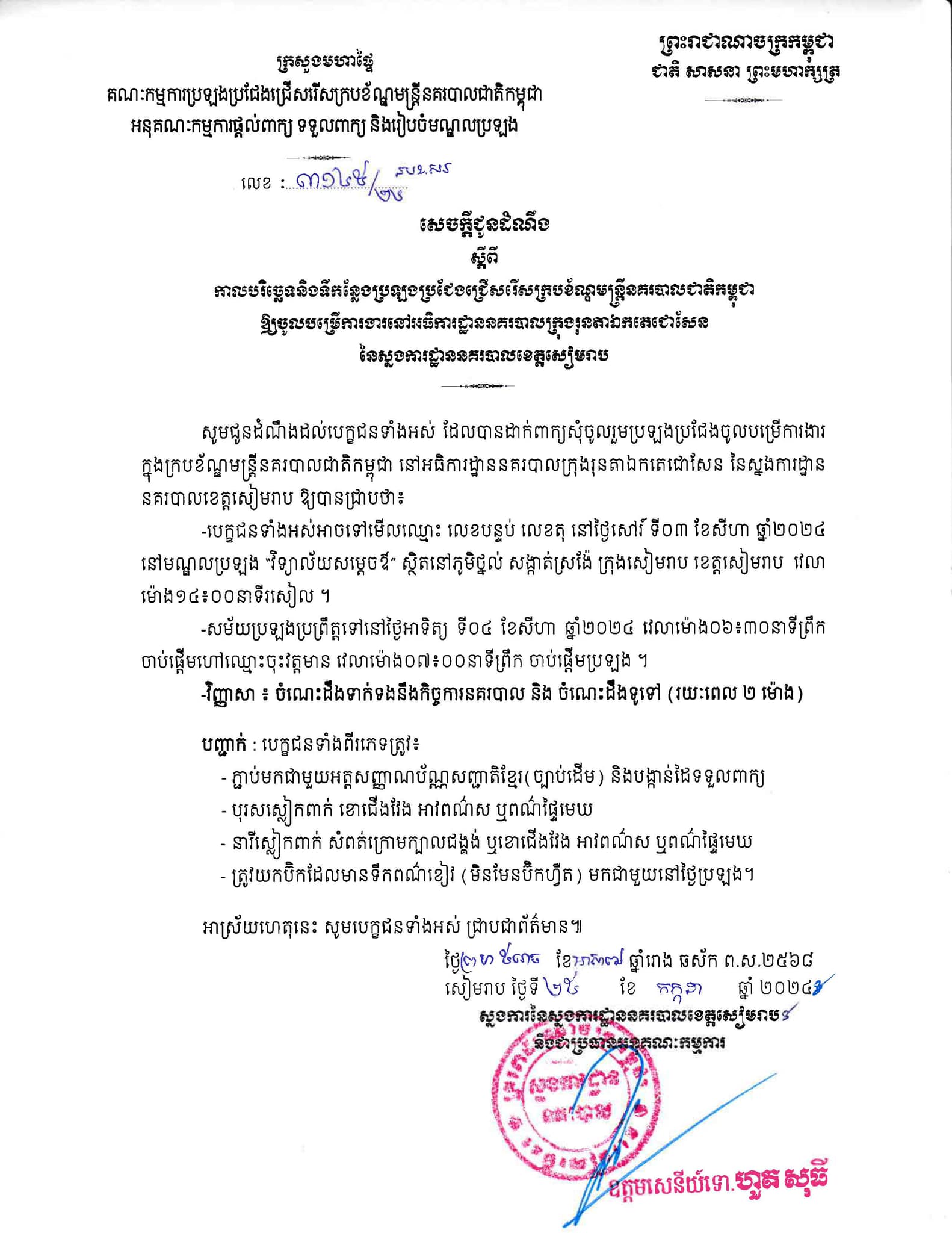 ខេត្តសៀមរាប​៖ នៅថ្ងៃទី២៦ ខែកក្កដា ឆ្នាំ២០២៤ យោងតាមការចុះផ្សាយរបស់ ស្នងការដ្ឋាននគរបាលខេត្តសៀមរាប បានចេញសេចក្ដីជូនដំណឹង ស្ដីពីកាលបរិច្ឆេទ និងទីកន្លែងប្រឡងជ្រើសរើសក្របខ័ណ្ឌមន្រ្តីនគរបាលជាតិកម្ពុជា ឱ្យចូលបម្រើការងារនៅអធិការដ្ឋាននគរបាល ក្រុងរុនតាឯកតេជោសែន នៃស្នងការដ្ឋាននគរបាលខេត្តសៀមរាប។