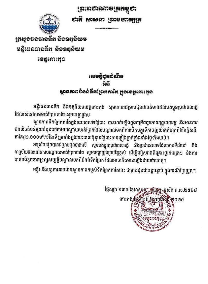 ខេត្តកោះកុង៖ នៅថ្ងៃទី២៦ ខែកក្កដា ឆ្នាំ២០២៤ មន្ទីរធនធានទឹក និងឧតុនិយមខេត្តកោះកុង បានចេញសេចក្តីជូនដំណឹងជូនដល់បងប្អូនប្រជាពលរដ្ឋ ដែលរស់នៅតាមមាត់ព្រែកតាតៃថា ស្ថានភាពទឹកព្រែកតាតៃក្នុងរយៈពេល២ថ្ងៃនេះ បានហក់ឡើងក្នុងកម្រិតគួរឱ្យព្រួយបារម្ភ និងមានការ ជន់លិចតំបន់មួយចំនួននៅតាមបណ្តោយមាត់ព្រែក ដែលបណ្តាលមកពីការបើកបង្ហូរទឹកចេញយ៉ាងគំហុកពីវារីអគ្គិសនី តាតៃ (២.០០០ម/១វិនាទី)រួមទាំងក្នុងរយៈពេលប៉ុន្មានថ្ងៃនេះមានភ្លៀងធ្លាក់ខ្លាំងទាំងថ្ងៃទាំងយប់។