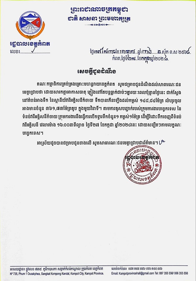 សូមប្រុងប្រយ័ត្ន! អាជ្ញាធរខេត្តកំពត ជូនដំណឹងថា ក្រុមបច្ចេកទេស នឹងធ្វើការបើកទ្វារបង្ហូរទឹកចេញពីអាងស្តុកទំនប់វារីអគ្គិសនីកំចាយ នារសៀលនេះ