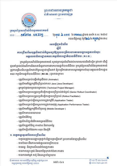 ក្រសួងប្រៃសណីយ៍ ប្រកាសជ្រើសរើសបុគ្គលិកជាប់កិច្ចសន្យាឱ្យចូលបម្រើការងារតាមបណ្តាអង្គភាពចំណុះអគ្គលេខាធិការដ្ឋានគណៈកម្មាធិការរដ្ឋាភិបាលឌីជីថល (គ.រ.ឌ.)