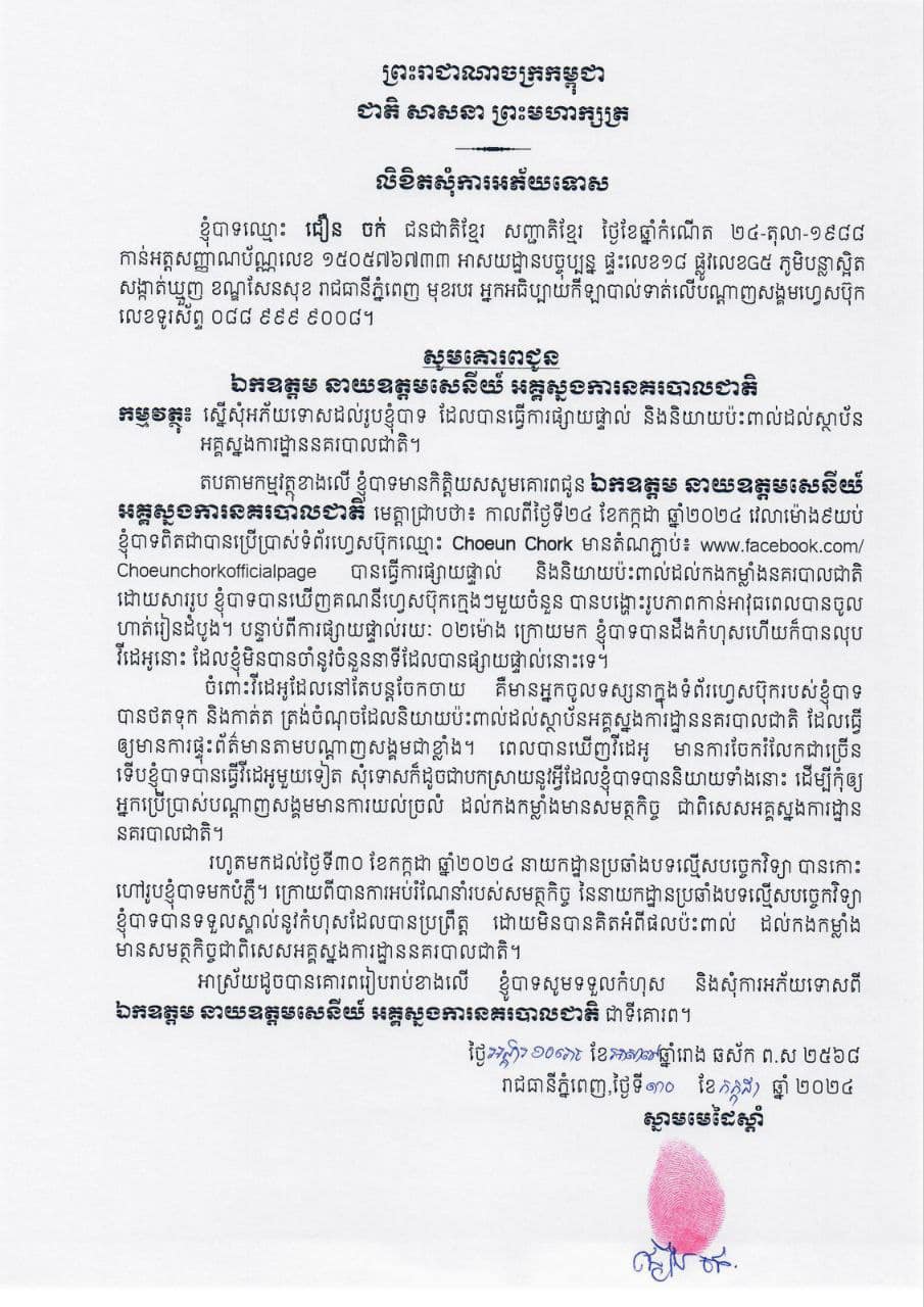 ចំពោះមុខសមត្ថកិច្ចឈ្មោះ ជឿន ចក់ ហៅជីងចក់ បានទទួលស្គាល់នូវកំហុសរបស់ខ្លួន នៅពេលផ្សាយផ្ទាល់លើទំព័រហ្វេសប៊ុករបស់ខ្លួន ដោយបាននិយាយលើសលួសប៉ះពាល់ដល់ស្ថាប័នកងកម្លាំង ជាពិសេសគឺអគ្គស្នងការដ្ឋាននគរបាលជាតិ និងបានលុបនូវវីដេអូ ក្រោយការផ្សាយចប់រយៈពេល ២ម៉ោងក្រោយ ប៉ុន្ដែមានទំព័រហ្វេសប៊ុកមួយចំនួនបានទាញយក វីដេអូនេះទៅកាត់យកចំនុចដែលខ្លួនបាននិយាយប្រមាថដោយអចេតនាទាំងនោះទៅផ្សាយបន្ដ និងមានការចែករំលែកជាច្រើនទៀត។