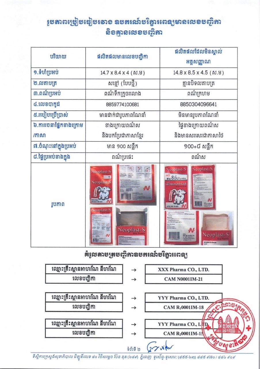 ក្រសួងសុខាភិបាល ពិនិត្យឃើញមានឧបករណ៍បរិក្ខារពេទ្យឈ្មោះ Neoplast-S គ្មានលេខបញ្ជីកាពី ក្រសួងសុខាភិបាល កំពុងចរាចរលើទីផ្សារនៃព្រះរាជាណាចក្រកម្ពុជា ដែលមានលក្ខណៈស្រដៀងនឹងឧបករណ៍ បរិក្ខារពេទ្យដែលកំពុងចែកចាយដោយក្រុមហ៊ុន DKSH (Cambodia) Ltd. ដូចមានរូបភាពភ្ជាប់មកជាមួយ។