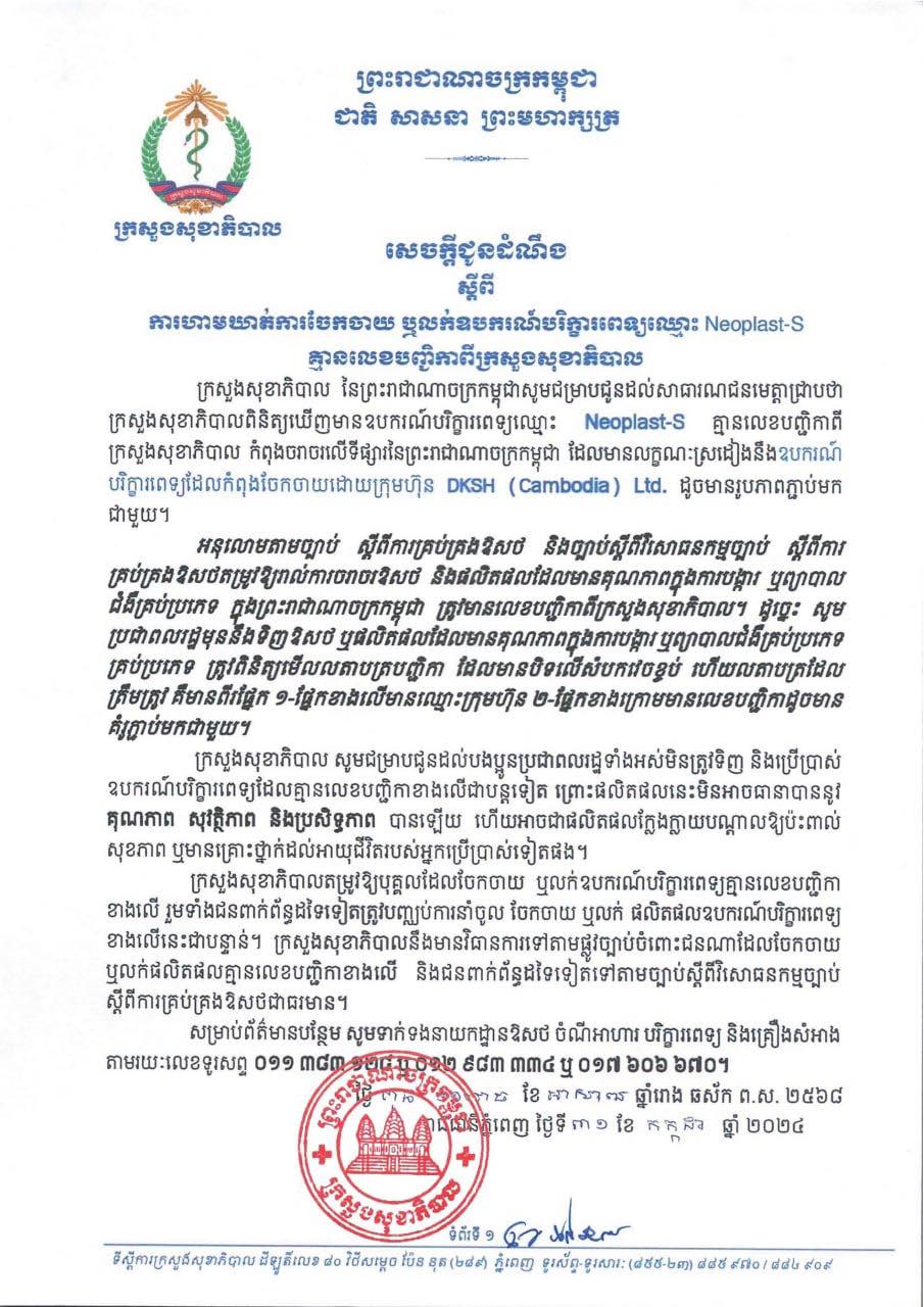ក្រសួងសុខាភិបាល ហាមឃាត់ការចែកចាយ ឬលក់ឧបករណ៍បរិក្ខារពេទ្យឈ្មោះ Neoplast-S ដែលគ្មានលេខបញ្ជិកាពីក្រសួង