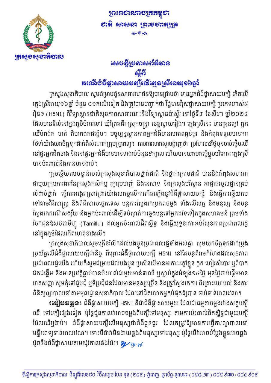 តាមរយៈសេចក្តីប្រកាសព័ត៌មាន ក្រសួងសុខាភិបាលថា មានអ្នកជំងឺផ្តាសាយបក្សី កើតលើក្មេងស្រីអាយុ១៦ឆ្នាំ ចំនួន ០១ករណីទៀត និងត្រូវបានបញ្ជាក់ថា វិជ្ជមានវីរុសផ្តាសាយបក្សី ប្រភេទ H5N1 ពីវិទ្យាស្ថានជាតិសុខភាពសាធារណៈ និងវិទ្យាស្ថានប៉ាស្ទ័រ នៅថ្ងៃទី៣ ខែសីហា ឆ្នាំ២០២៤ ដែលមានទីលំនៅក្នុងភូមិចំការលាវ ឃុំព្រៃគគីរ ស្រុកចន្ទ្រា ខេត្តស្វាយរៀង។ ក្មេងស្រីនេះមានគ្រុនក្តៅ ក្អក ឈឺបំពង់ក ហត់ ពិបាកដកដង្ហើម។