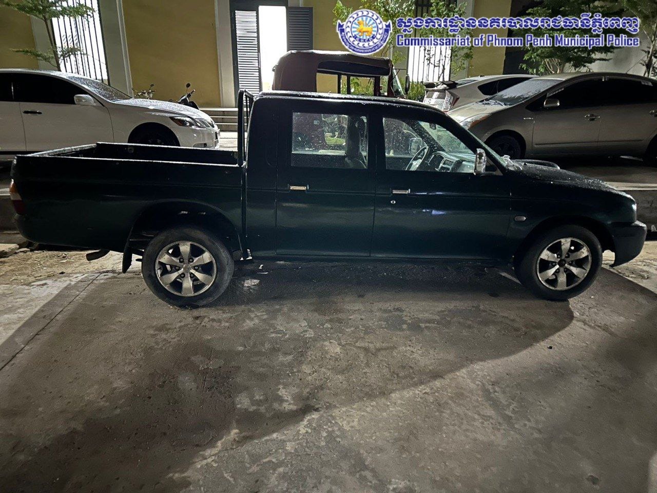 សម្ភារបាត់បង់ រថយន្តម៉ាក MITSUBISHI PICKUP ពណ៌បៃតងចាស់ ពាកផ្លាកលេខ ភ្នំពេញ 2E-1893 ។ វត្ថុតាងចាប់យកបានរួមមាន៖ រថយន្តម៉ាក MITSUBISHI PICKUP ពណ៌បៃតងចាស់ ពាកផ្លាកលេខ ភ្នំពេញ 2E-1893 (ផលនៃបទល្មើស), ម៉ូតូម៉ាក ម៉ីអូ ពណ៌ក្រហម ពាក់ផ្លាកលេខ ភ្នំពេញ 1M-0362 (មធ្យោបាយជិះធ្វើសកម្មភាព)។