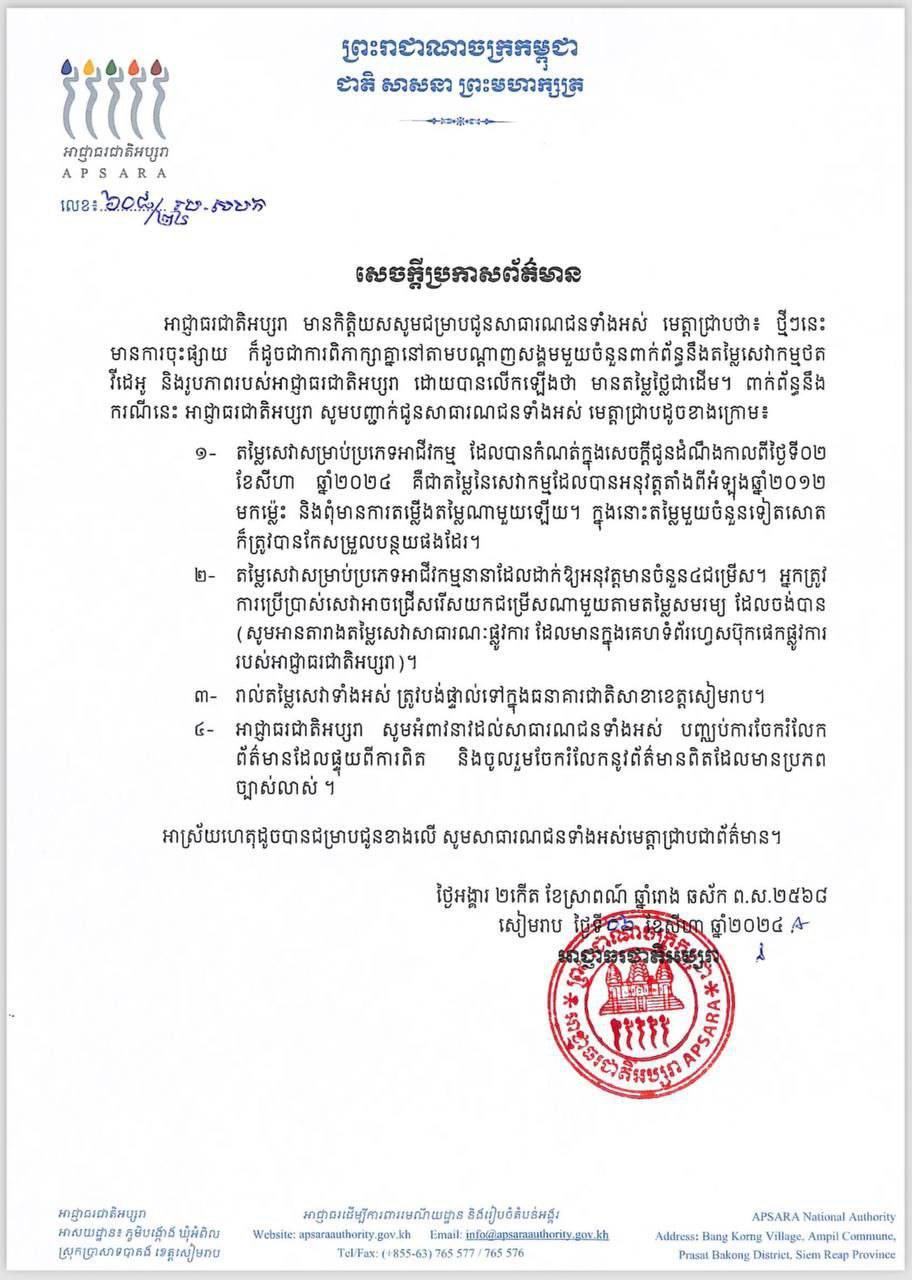 ខេត្តសៀមរាប៖ នៅថ្ងៃទី០៦ ខែសីហា ឆ្នាំ២០២៤ យោងតាមការចុះផ្សាយរបស់ អាជ្ញាធរជាតិអប្សរា បានចេញសេចក្ដីប្រកាសព័ត៌មាន អំពីការផ្សព្វផ្សាយ និងការពិភាក្សានៅតាមបណ្តាញសង្គមមួយចំនួនពាក់ព័ន្ធនឹងតម្លៃសេវាថតវីដេអូ និងរូបភាពរបស់អាជ្ញាធរជាតិអប្សរា ដោយបានលើកឡើងថាមានតម្លៃថ្លៃជាដើម។