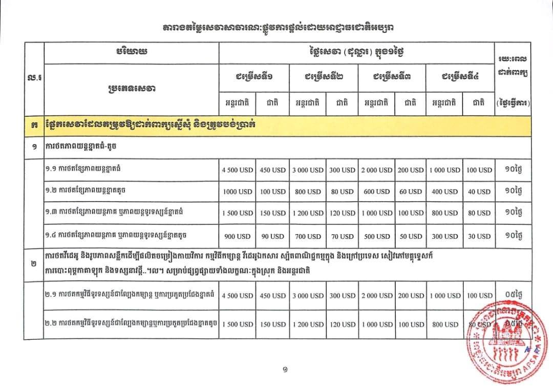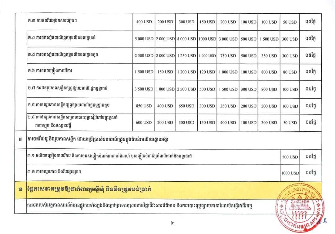 អាជ្ញាធរជាតិអប្សរា បញ្ជាក់ថា តម្លៃសេវាថតវីដេអូ និងរូបភាព ប្រភេទអាជីវកម្ម គឺបានអនុវត្តតាំងពីឆ្នាំ២០១២មកម៉្លេះ ពុំមានការតម្លើងតម្លៃណាមួយឡើយ