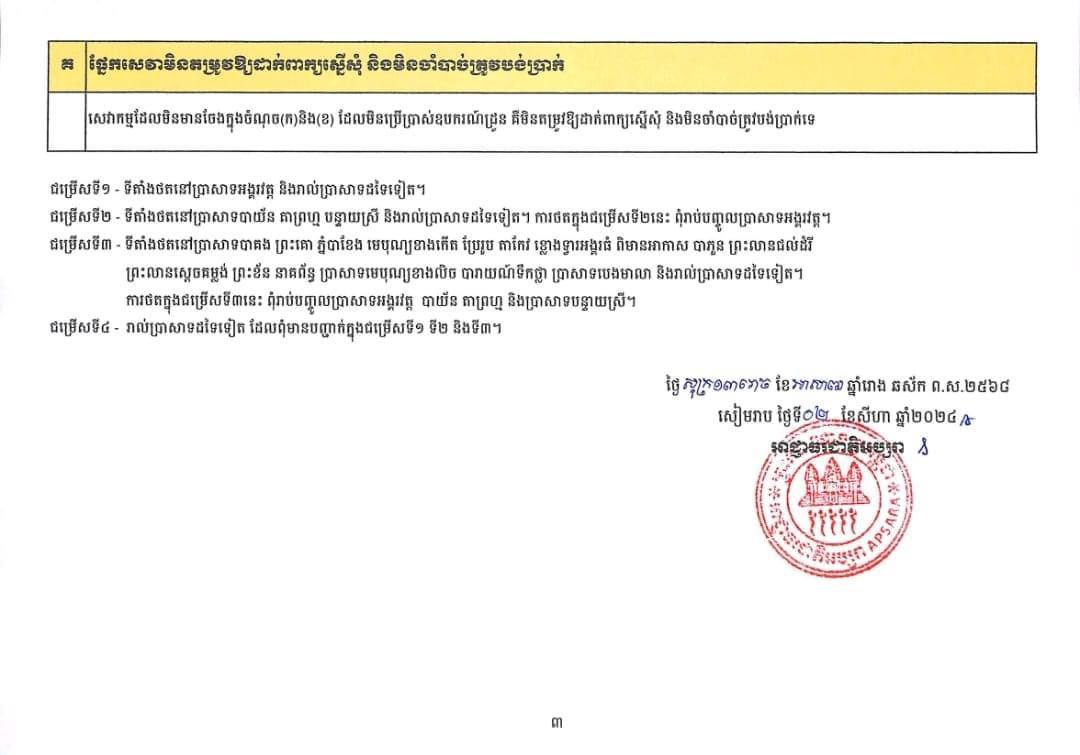 ៣- រាល់តម្លៃសេវាទាំងអស់ ត្រូវបង់ផ្ទាល់ទៅក្នុងធនាគារជាតិសាខាខេត្តសៀមរាប។