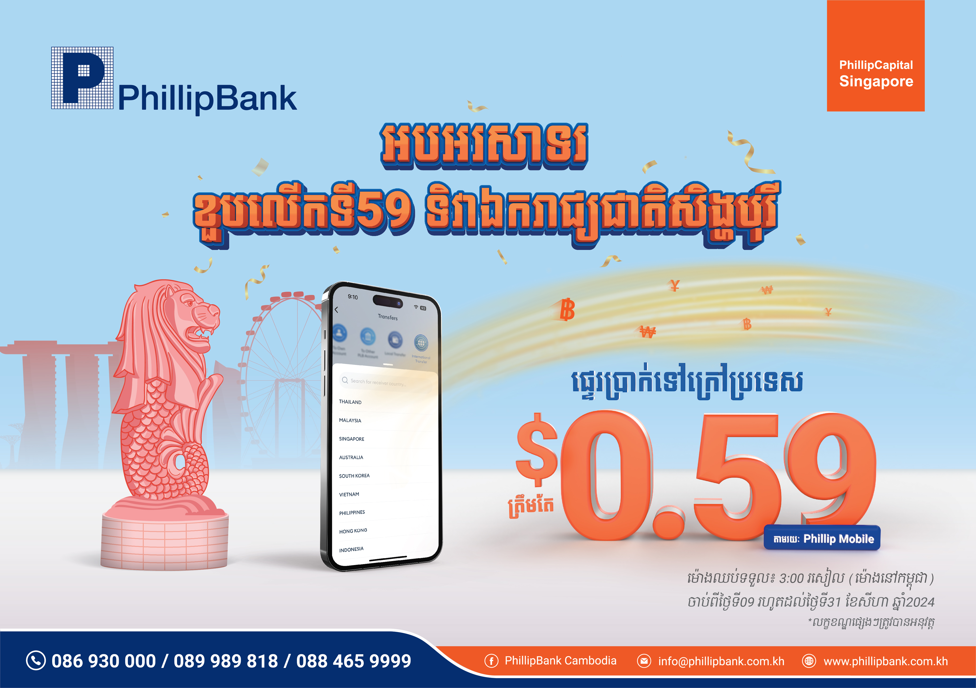 មិនត្រឹមក្លាយជាជំនួយការពិសេសសម្រាប់អតិថិជនរបស់ខ្លួនទេ ធនាគារ ហ្វីលីព ថែមទាំងមានការផ្ដល់ជូនអស្ចារ្យថ្មីមួយទៀត ។ អ្នកទាំងអស់គ្នាចំណាយត្រឹមតែ 0.59 ដុល្លារ ប៉ុណ្ណោះ ចាប់ពីថ្ងៃទី 09 ខែសីហា ដល់ថ្ងៃទី 31 ខែសីហា ឆ្នាំ 2024 ដើម្បីផ្ទេរប្រាក់ទៅកាន់ប្រទេសទាំង ៩ តាមរយៈកម្មវិធីធនាគារចល័ត Phillip Mobile។