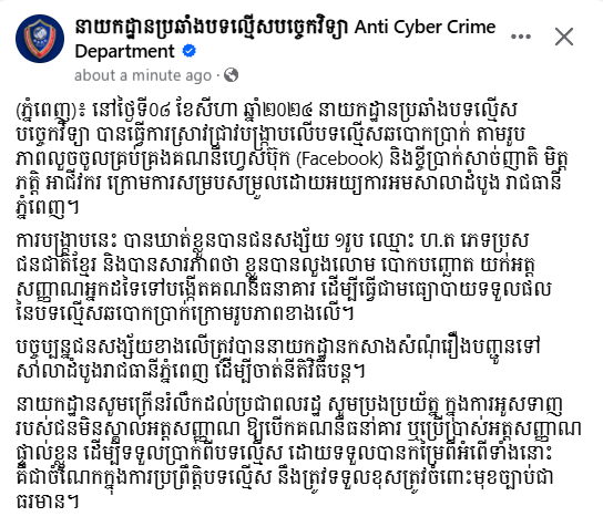 រាជធានីភ្នំពេញ៖ យោងតាមការចុះផ្សាយរបស់ នាយកដ្ឋានប្រឆាំងបទល្មើសបច្ចេកវិទ្យា បានឱ្យដឹងថា នៅថ្ងៃទី០៨ ខែសីហា ឆ្នាំ២០២៤ នាយកដ្ឋានប្រឆាំងបទល្មើសបច្ចេកវិទ្យា បានធ្វើការស្រាវជ្រាវបង្រ្កាបលើបទល្មើសឆបោកប្រាក់ តាមរូបភាពលួចចូលគ្រប់គ្រងគណនីហ្វេសប៊ុក (Facebook) និងខ្ចីប្រាក់សាច់ញាតិ មិត្តភក្កិ អាជីវករ ក្រោមការសម្របសម្រួលដោយអយ្យការអមសាលាដំបូង រាជធានីភ្នំពេញ។