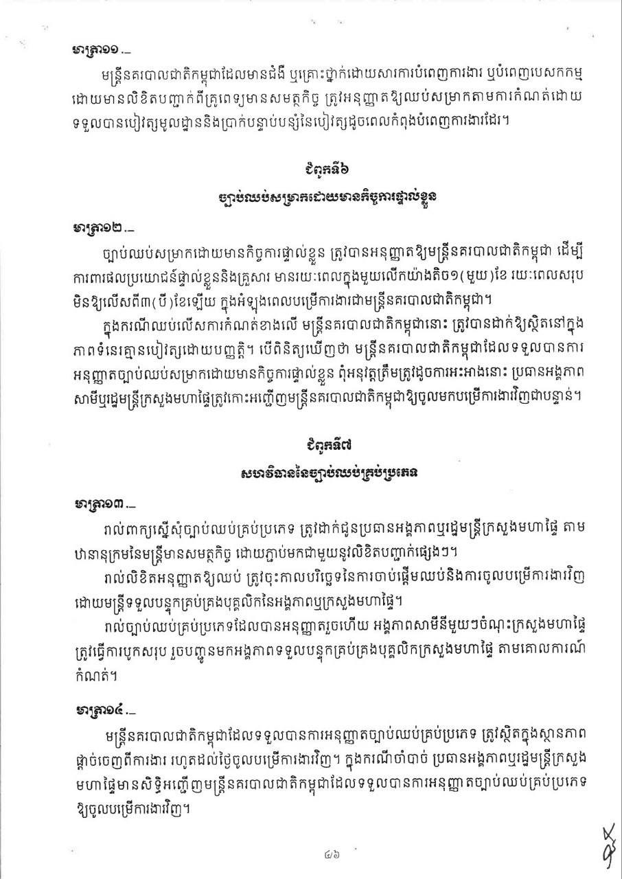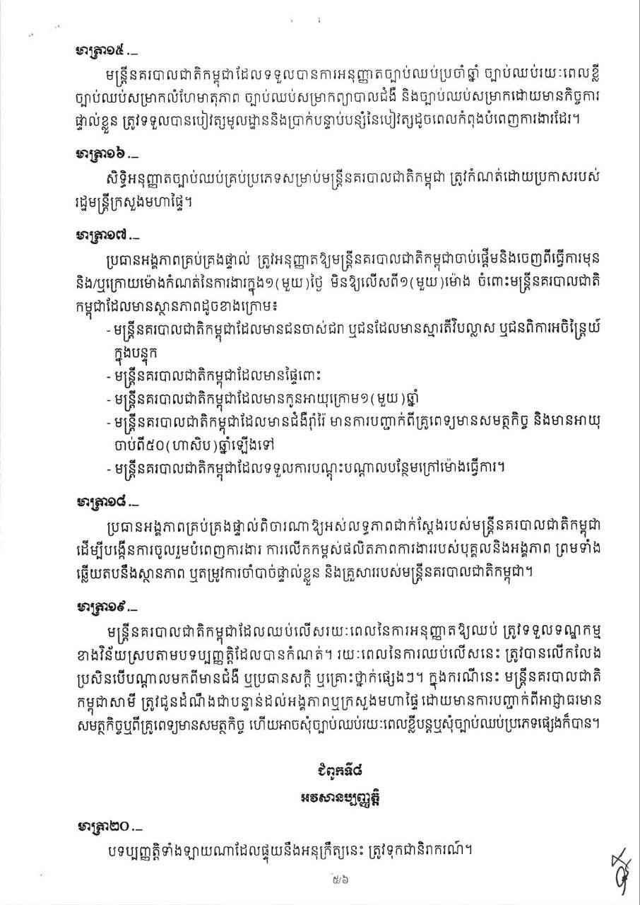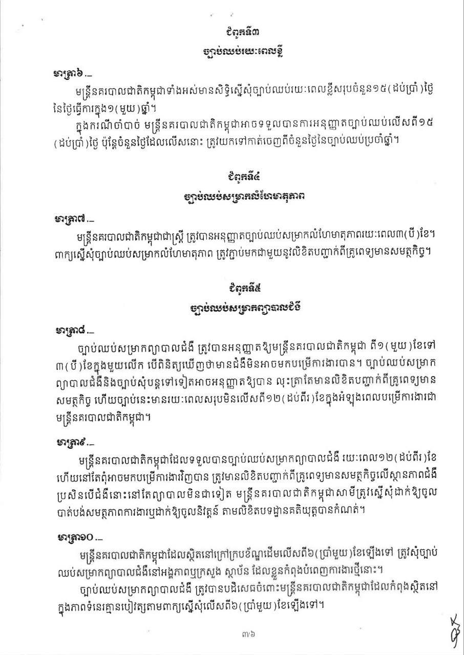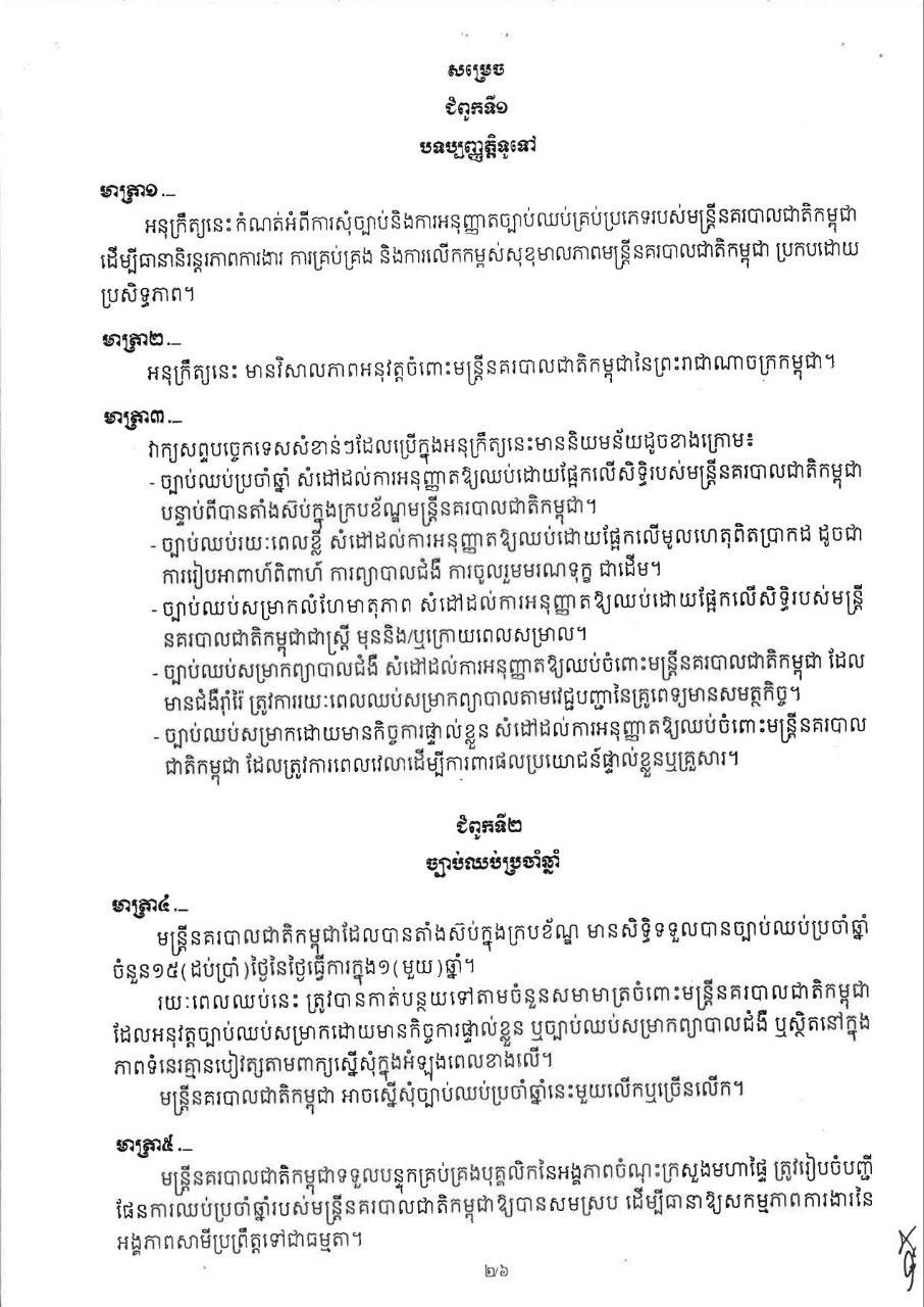 ក្នុងមាត្រា៤៖ មន្ត្រីនគរបាលជាតិកម្ពុជាដែលបានតាំងស៊ប់ក្នុងក្របខ័ណ្ឌ មានសិទ្ធិទទួលបានច្បាប់ឈប់ប្រចាំឆ្នាំ ចំនួន១៥ (ដប់ប្រាំ)ថ្ងៃនៃថ្ងៃធ្វើការក្នុង១ (មួយ)ឆ្នាំ។