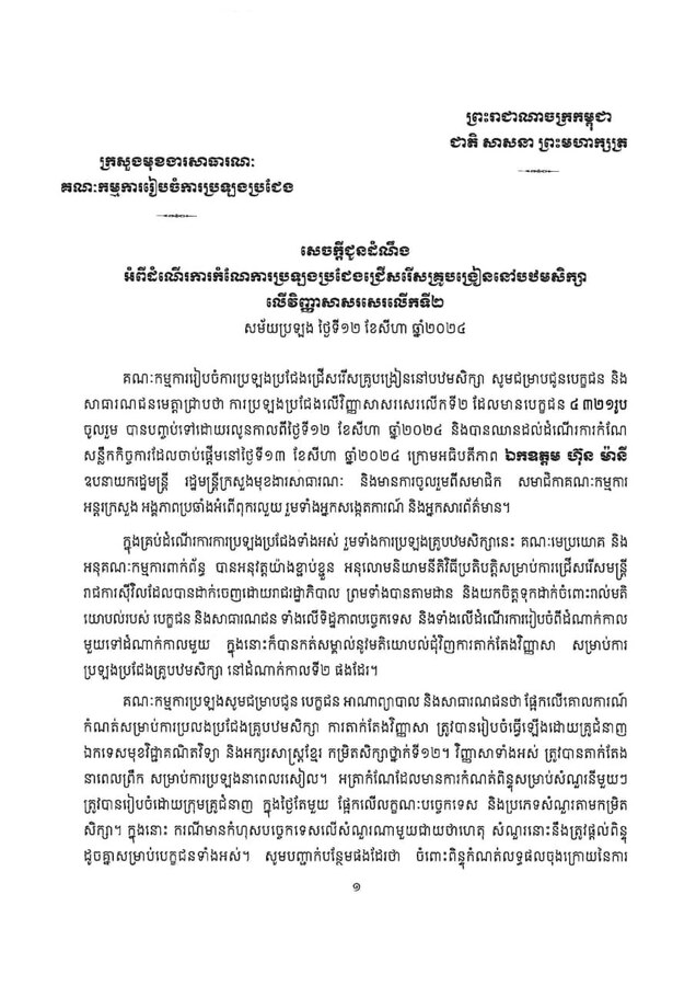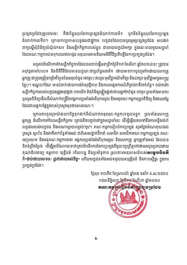 ជាមួយគ្នានោះ ដំណើរការកំណែសន្លឹកកិច្ចការ គ្រោងនឹងបញ្ចប់នៅក្នុងសប្ដាហ៍នេះ ដើម្បីឆ្លើយតបទៅនឹងការទន្ទឹងរង់ចាំ លទ្ធផលរបស់បេក្ខជន និងអាណាព្យាបាលគ្រប់ៗរូប៕