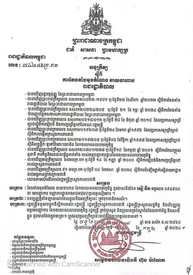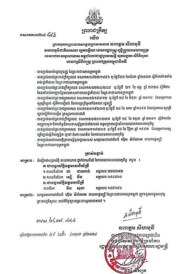 សូមបញ្ជាក់ជូនថា លោកឧត្តមសេនីយ៍ត្រី សៀ ទីន នាថ្ងៃទី២២ ខែកក្កដា ឆ្នាំ២០២៤នេះ ត្រូវបានសម្តេចធិបតី ហ៊ុន ម៉ាណែត នាយករដ្ឋមន្ត្រីកម្ពុជា បានចេញអនុក្រឹត្យ តែងតាំងមុខតំណែងជាមេបញ្ជាការ បញ្ជាការដ្ឋានកងរាជអាវុធហត្ថខេត្តសៀមរាប និងត្រូវបានព្រះមហាក្សត្រដំឡើងឋានន្តរស័ក្តិជាឧត្តមសេនីយ៍ត្រី នាថ្ងៃទី២៥ ខែកក្កដា ឆ្នាំ២០២៤៕