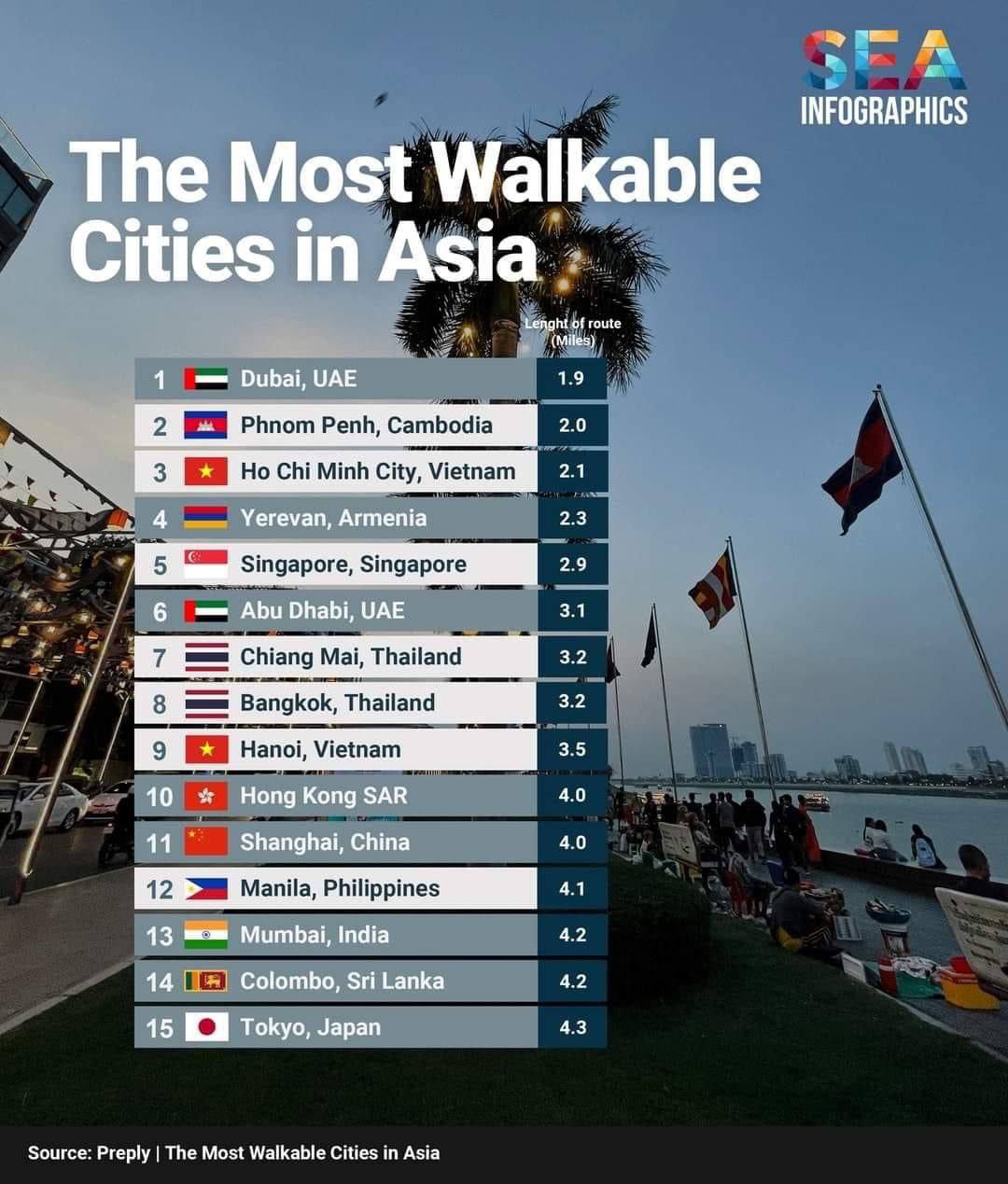 រាជធានីភ្នំពេញ ជាប់ចំណាត់ថ្នាក់ទីពីរ ជាទីក្រុងដែលអាចដើរបានច្រើនបំផុតនៅអាស៊ី