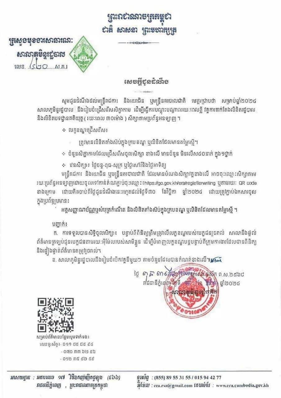 *វេនសិក្សា៖ ថ្ងៃចន្ទ-ពុធ-សុក្រ ឬថ្ងៃសៅរ៍ និងថ្ងៃអាទិត្យ មន្ត្រីរាជការ និងយោធិន ឬមន្ត្រីនគរបាលជាតិ ដែលមានបំណងសិក្សាវគ្គខាងលើ អាចចុះឈ្មោះសិក្សាតាម រយៈប្រព័ន្ធអនឡាញដោយចូលទៅកាន់តំណភ្ជាប់ចុះឈ្មោះ៖ https://go.gov.khVera/regletterwriting ឬតាមរយៈ QR code ខាងក្រោម ដោយគិតចាប់ពីថ្ងៃជូនដំណឹងនេះ រហូតដល់ថ្ងៃទី៣០ ខែវិច្ឆិកា ឆ្នាំ២០២៤ ដោយត្រូវភ្ជាប់ឯកសារចូល ក្នុងប្រព័ន្ធរួមមាន៖ អត្តសញ្ញាណប័ណ្ណឬសំបុត្រកំណើត និងលិខិតតាំងស៊ប់ក្នុងក្របខណ្ឌ ឬលិខិតដែលមានតម្លៃស្មើ ។