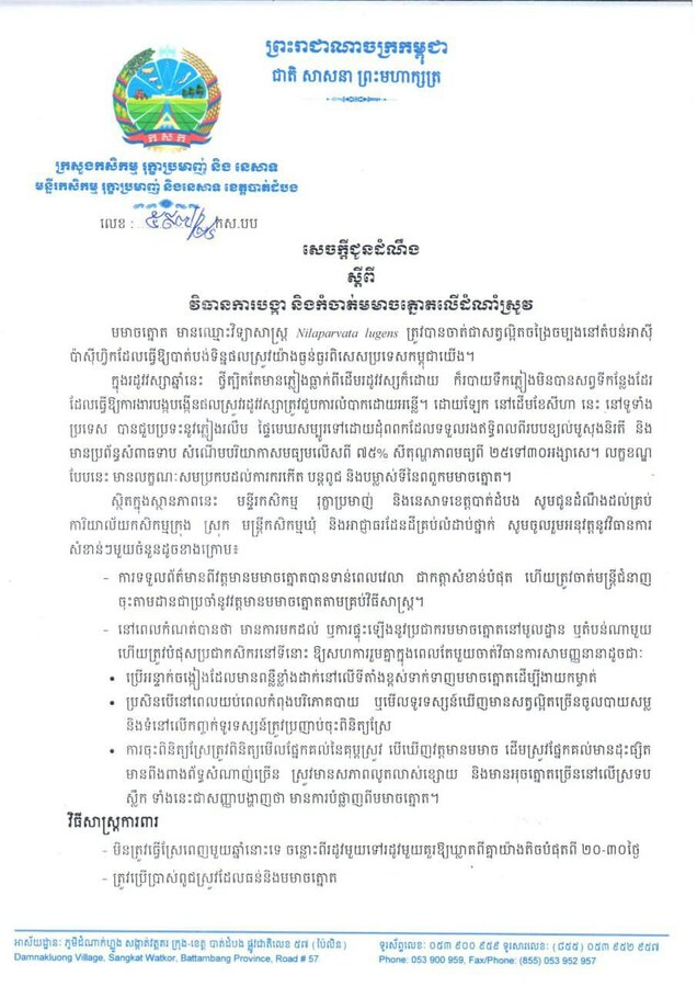 ខេត្តបាត់ដំបង៖ យោងតាមការចុះផ្សាយរបស់ ក្រសួងព័ត៌មាន បានឱ្យដឹងថា មន្ទីរកសិកម្មនិងរុក្ខាប្រមាញ់ ខេត្តបាត់ដំបង បានបញ្ជាក់ថា សត្វមមាចត្នោតកំពុងរាតត្បាតស្រូវកសិករភូមិចំនួន៣ ក្នុងឃុំពាមឯក ស្រុកឯកភ្នំ ខេត្តបាត់ដំបង មានភូមិគងទុំ ភូមិករហាល និងភូមិចុងឆ្តោរ (ចំណុចអាងភាស) ប្រមាណ ១១១ហិកតា ដែលក្នុងមួយហិកតាមានការស៊ីជញ្ជក់ស្រូវក្នុងដំណាក់កាលផើមចេញផ្កាចន្លោះពី ១០ទៅ ២៥ម៉ែត្រការ៉េ។