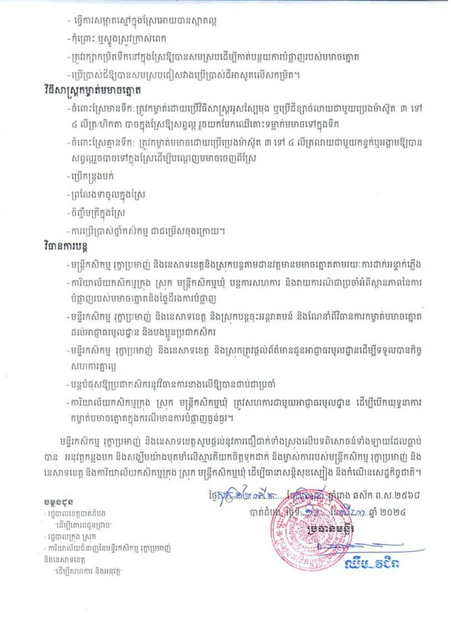 ទោះបីយ៉ាងណាមន្ទីរកសិកម្មបញ្ជាក់ថាគិតត្រឹមថ្ងៃទី១៦ ខែសីហានេះ ស្ថានភាពនៃការរាតត្បាតដោយមមាចត្នោតនៅតំបន់នេះ ត្រូវបានគ្រប់គ្រង មានការថយចុះ។