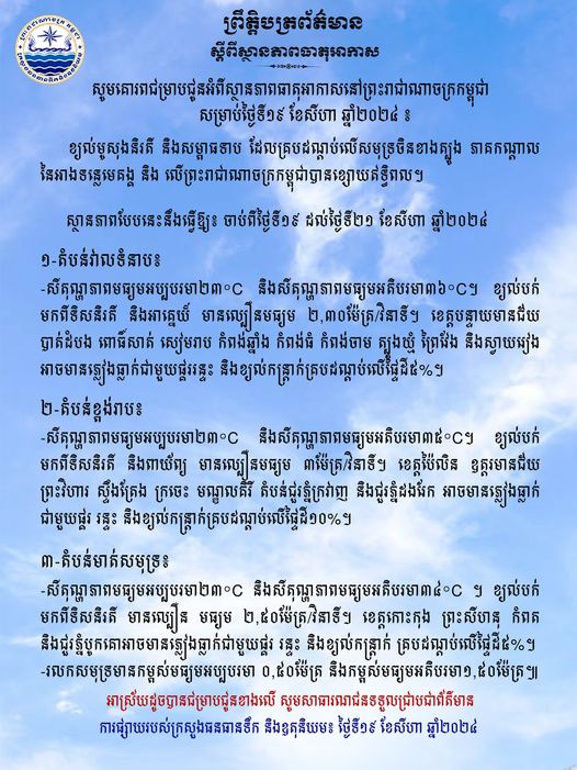 ក្រសួងធនធានទឹក បានឱ្យដឹងថា ខ្យល់មូសុងនិរតី និងសម្ពាធទាប ដែលគ្របដណ្ដប់លើសមុទ្រចិនខាងត្បូង ភាគកណ្តាលនៃអាងទន្លេមេគង្គ និង លើព្រះរាជាណាចក្រកម្ពុជាបានខ្សោយឥទ្ធិពល។ ស្ថានភាពបែបនេះនឹងធ្វើឱ្យចាប់ពីថ្ងៃទី១៩ ដល់ថ្ងៃទី២១ ខែសីហា ឆ្នាំ២០២៤៖