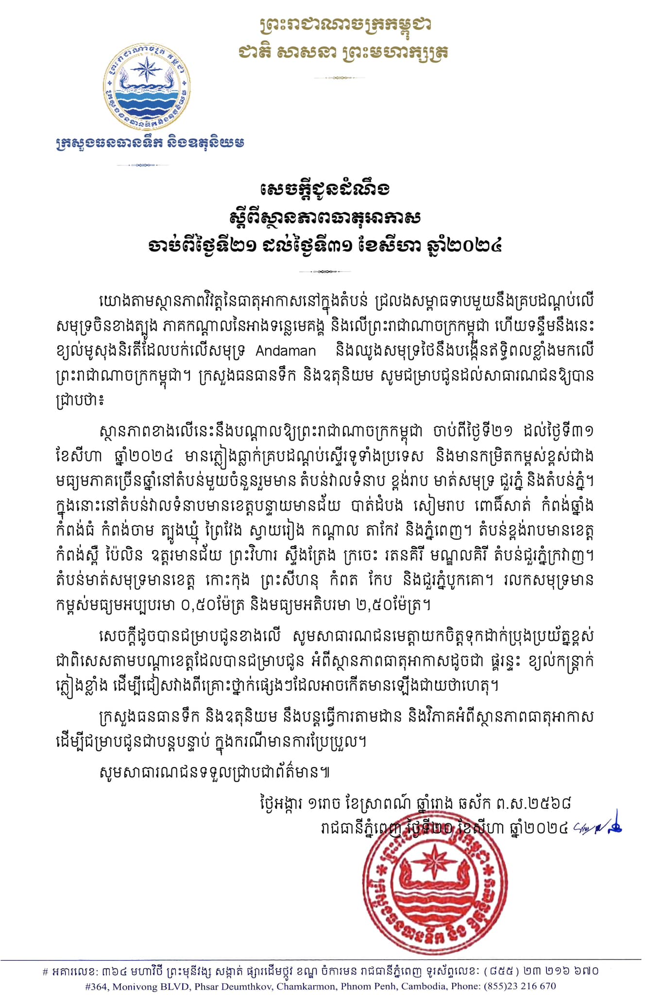 រាជធានីភ្នំពេញ៖ នៅថ្ងៃទី២០ ខែសីហា ឆ្នាំ២០២៤ យោងតាមការចុះផ្សាយរបស់ ក្រសួងធនធានទឹក និងឧតុនិយម បានចេញសេចក្តីជូនដំណឹង ស្តីពីស្ថានភាពធាតុអាកាស ចាប់ពីថ្ងៃទី២១ ដល់ថ្ងៃទី៣១ ខែសីហា ឆ្នាំ២០២៤។