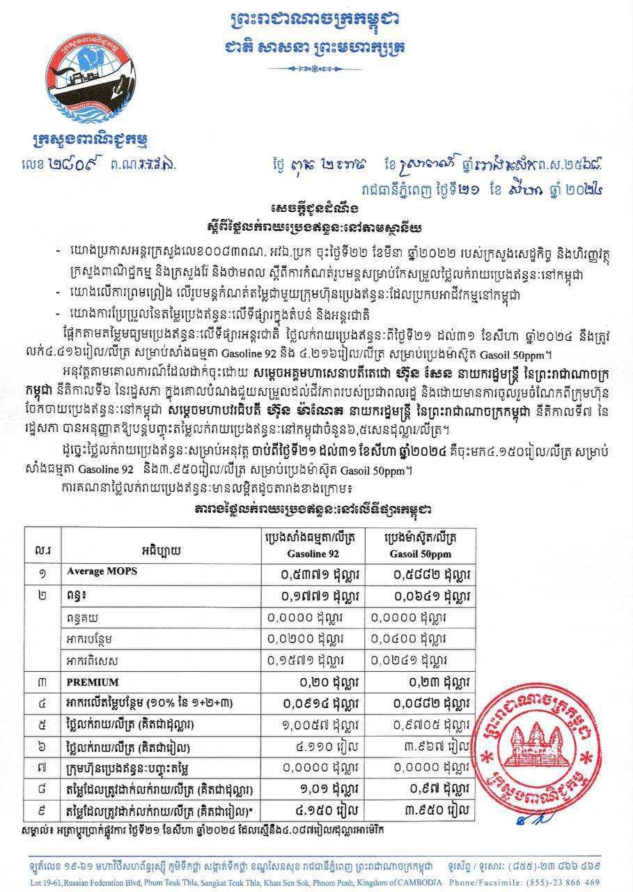 រាជធានីភ្នំពេញ៖ នៅថ្ងៃទី២១ ខែសីហា ឆ្នាំ២០២៤ យោងតាមការចុះផ្សាយរបស់ ក្រសួងពាណិជ្ជកម្ម បានចេញសេចក្តីជូនដំណឹង ប្រកាសពីតម្លៃលក់រាយប្រេងឥន្ធនៈ នៅតាមស្ថានីយនានាដោយចាប់ពីថ្ងៃទី២១ ដល់ថ្ងៃទី៣១ ខែសីហា ឆ្នាំ២០២៤ ត្រូវលក់សាំងធម្មតាតម្លៃ ៤,១៥០រៀល និងម៉ាស៊ូតត្រូវលក់ ៣,៩៥០រៀល ក្នុង១លីត្រ។