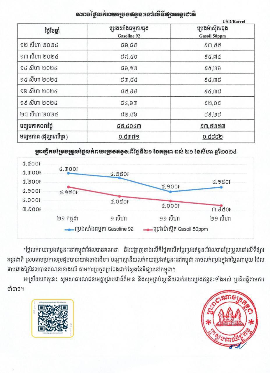 មកដឹងពីតម្លៃលក់រាយប្រេងឥន្ធនៈថ្មី ដែលត្រូវអនុវត្តចាប់ពីថ្ងៃនេះ ដល់ថ្ងៃទី៣១ ខែសីហា