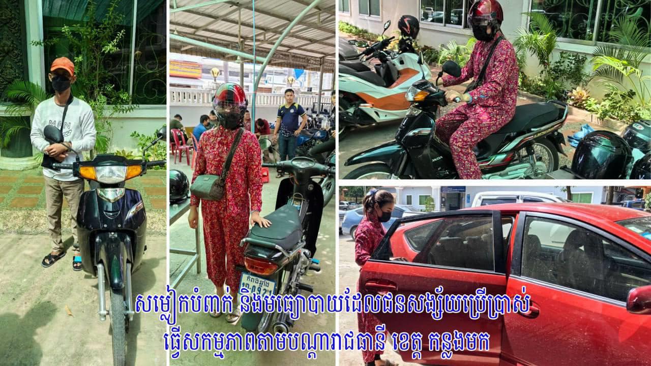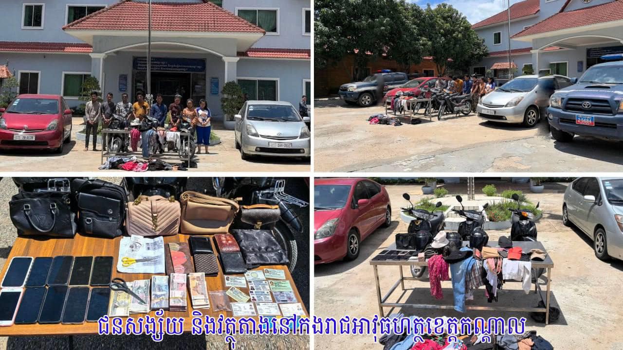 ចាប់យកវត្ថុតាងពីក្រុមជនសង្ស័យមួយចំនួនរួមមាន៖ រថយន្ត ម៉ាក Toyota Prius ចំនួន២គ្រឿង, ម៉ូតូម៉ាក Honda dream C១២៥ ចំនួន ០៣គ្រឿង, មួកសុវត្ថិភាពចំនួន ០៣, ទូរស័ព្ទដៃចំនួន ១០គ្រឿង, កាបូបស្បែកតូចធំចំនួន ០៩, ថង់ក្រណាត់សម្រាប់ដាក់ប្រាក់លួចបានចំនួន ០២, សំលៀកបំពាក់បុរសស្រ្តី សម្រាប់ផ្លាស់ប្តូរមុនពេលនិងក្រោយពេលធ្វើសកម្មភាពរួច មួយចំនួន, អត្តសញ្ញាណប័ណ្ណសញ្ជាតិខ្មែរចំនួន ០៥, ប័ណ្ណសម្គាស់ទោចក្រក្រយាន្តចំនួន ០២, ប័ណ្ណបើកបរចំនួន ០២, លោហៈធាតុពណ៌លឿង (ក្រវិល ០១គូ ចិញ្ចៀនពណ៌លឿងលាយសចំនួន ០២វង់) និងប្រាក់រៀលមួយចំនួន។