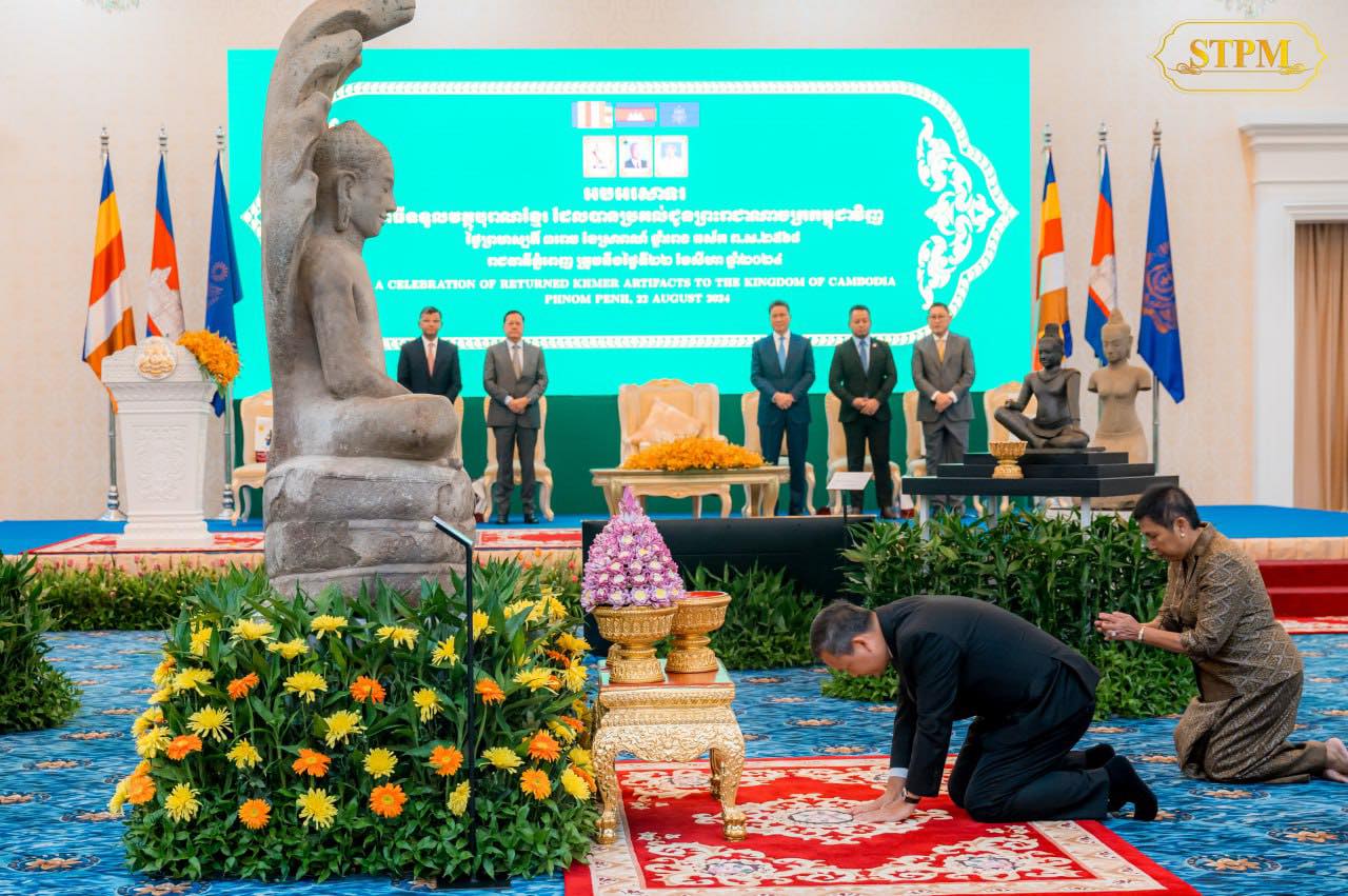 រាជធានីភ្នំពេញ៖ នៅព្រឹកថ្ងៃព្រហស្បតិ៍ ទី២២ ខែសីហា ឆ្នាំ២០២៤ វត្ថុបុរាណខ្មែរចំនួន៧០ ត្រូវបានប្រគល់ត្រឡប់មកមាតុភូមិវិញ ក្រោយពីបាត់បង់អស់រយៈពេលរាប់សិបឆ្នាំ។ នេះបើយោងតាមការបង្ហោះពីគណនីហ្វេសប៊ុកផ្លូវការរបស់ សម្តេចមហាបវរធិបតី ហ៊ុន ម៉ាណែត នាយករដ្ឋមន្ត្រីនៃព្រះរាជាណាចក្រកម្ពុជា។