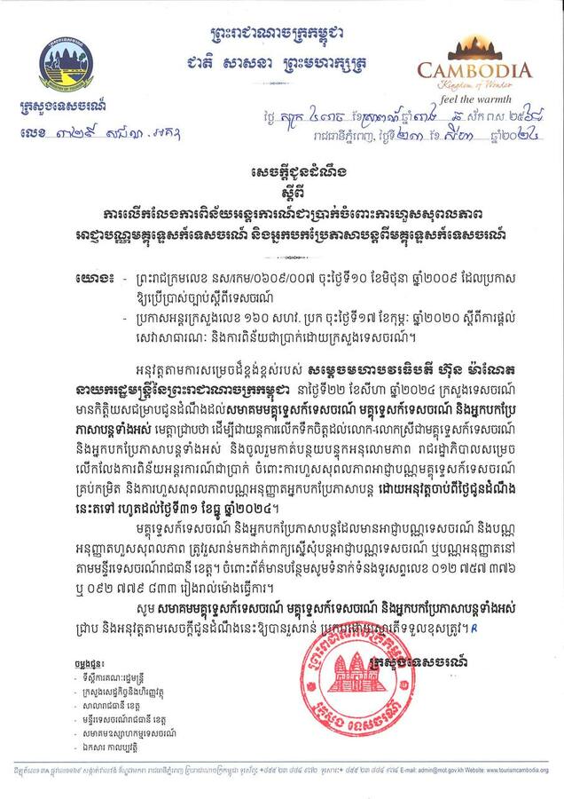 រាជធានីភ្នំពេញ៖ យោងតាមការចុះផ្សាយរបស់ ក្រសួងព័ត៌មាន បានឱ្យដឹងថា ដើម្បីជាយន្តការលើកទឹកចិត្តដល់លោក-លោកស្រីជា មគ្គុទ្ទេសក៍ទេសចរណ៍ និងអ្នកបកប្រែភាសាបន្តទាំងអស់ និងចូលរួមកាត់បន្ថយបន្ទុកអនុលោមភាព ក្រសួងទេសចរណ៍ ដែលជាសេនាធិការរបស់រាជរដ្ឋាភិបាល បានសម្រេចលើកលែងការពិន័យអន្តរការណ៍ជាប្រាក់ចំពោះការហួសសុពលភាព អាជ្ញាបណ្ណមគ្គុទ្ទេសក៍ទេសចរណ៍គ្រប់កម្រិត និងការហួសសុពលភាពបណ្ណអនុញ្ញាតអ្នកបកប្រែភាសាបន្ត ដោយអនុវត្តចាប់ពីថ្ងៃជូនដំណឹងនេះតទៅ រហូតដល់ថ្ងៃទី៣១ ខែធ្នូ ឆ្នាំ២០២៤។
