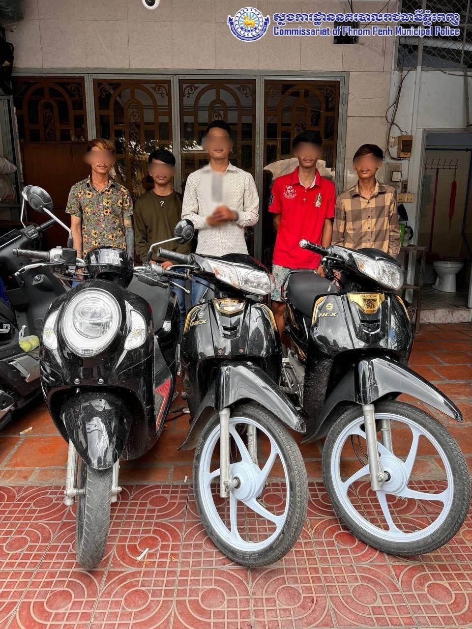 វត្ថុតាងចាប់យករួមមាន៖ ម៉ូតូ០៣គ្រឿង (ម៉ាកហុងដា សេ១២៥ ពណ៌ខ្មៅ សេរីឆ្នាំ២០២៤ ពាក់ស្លាកលេខ ភ្នំពេញ 1KK-3991, ម៉ាកហុងដា សេ125 ពណ៌ខ្មៅ សេរីឆ្នាំ២០២២ ពាក់ស្លាកលេខ ភ្នំពេញ 1CN-1230, ម៉ាក ហុងដាស្កុបពី ពណ៌ខ្មៅ សេរីឆ្នាំ២០២២ ពាក់ស្លាកលេខ ភ្នំពេញ 1JZ-6039), ទូរស័ព្ទដៃ៤គ្រឿង, ម៉ាក IPHONE 11 ពណ៌ទឹកសណ្តែក, ម៉ាក IPHONE XS MAX ពណ៌ខ្មៅ, ម៉ាក IPHONE 7 ពណ៌ផ្កាឈូក, ម៉ាក OPPO ពណ៌ខ្មៅ ជារបស់ជនសង្ស័យ។