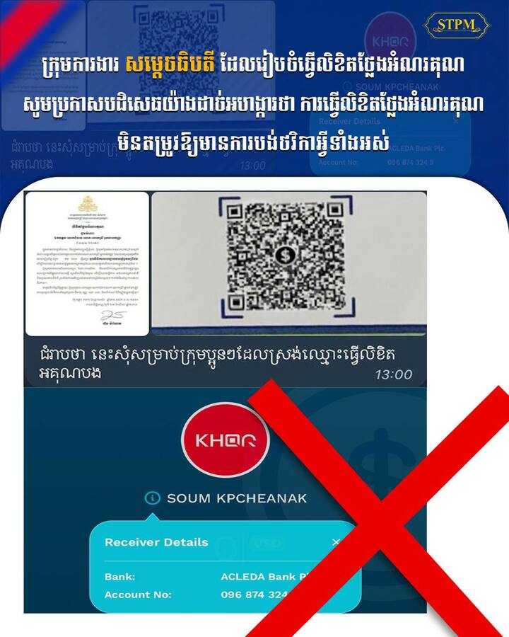 ដោយឡែកនារសៀលនេះផងដែរ ខុទ្ទកាល័យសម្តេចធិបតី ហ៊ុន ម៉ាណែត នាយករដ្ឋមន្ត្រីនៃកម្ពុជា ក៏បានអំពាវនាវដល់សប្បុរសជនទាំងអស់ មេត្តាមានការប្រុងប្រយ័ត្នខ្ពស់ផងដែរ ចំពោះការស្កេន QR Code ឬគណនីធនាគារ សម្រាប់បរិច្ចាគថវិកាដល់ «មូលនិធិកសាងហេដ្ឋារចនាសម្ព័ន្ធតាមព្រំដែន» ក្នុងការកសាងផ្លូវក្រវាត់ព្រំដែន ខណៈដែរមានជនខិលខូច បានលួចបន្លំកាត់ត QR Code គណនីធនាគារ សម្រាប់បរិច្ចាគថវិកាជូន «មូលនិធិកសាងហេដ្ឋារចនាសម្ព័ន្ធតាមព្រំដែន» ដែលមានឈ្មោះថា «LONG CHHNU» ៕