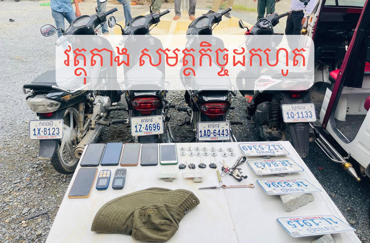 ដកហូតសម្ភារវត្ថុតាង៖ ម៉ូតូចំនួន៤គ្រឿង , ស្លាកលេខម៉ូតូ ចំនួន៤ ម៉ូតូប្រភេទផាសស្អាប់១គ្រឿង ដែកឆ្នៃប្រភេទកន្ទុយអន្ទង់អក្សរL ចំនួន១ គ្រាប់សំរាប់កឹបស្លាកលេខម៉ូតូចំនួន៧គូ សោរច្នៃសម្រាប់ចាក់ម៉ូតូចំនួន៤ ទូរស័ព្ទចំនួន៨គ្រឿង មួកក្រណាត់ពាក់ធ្វើសកម្មភាព ចំនួន ០១ ។