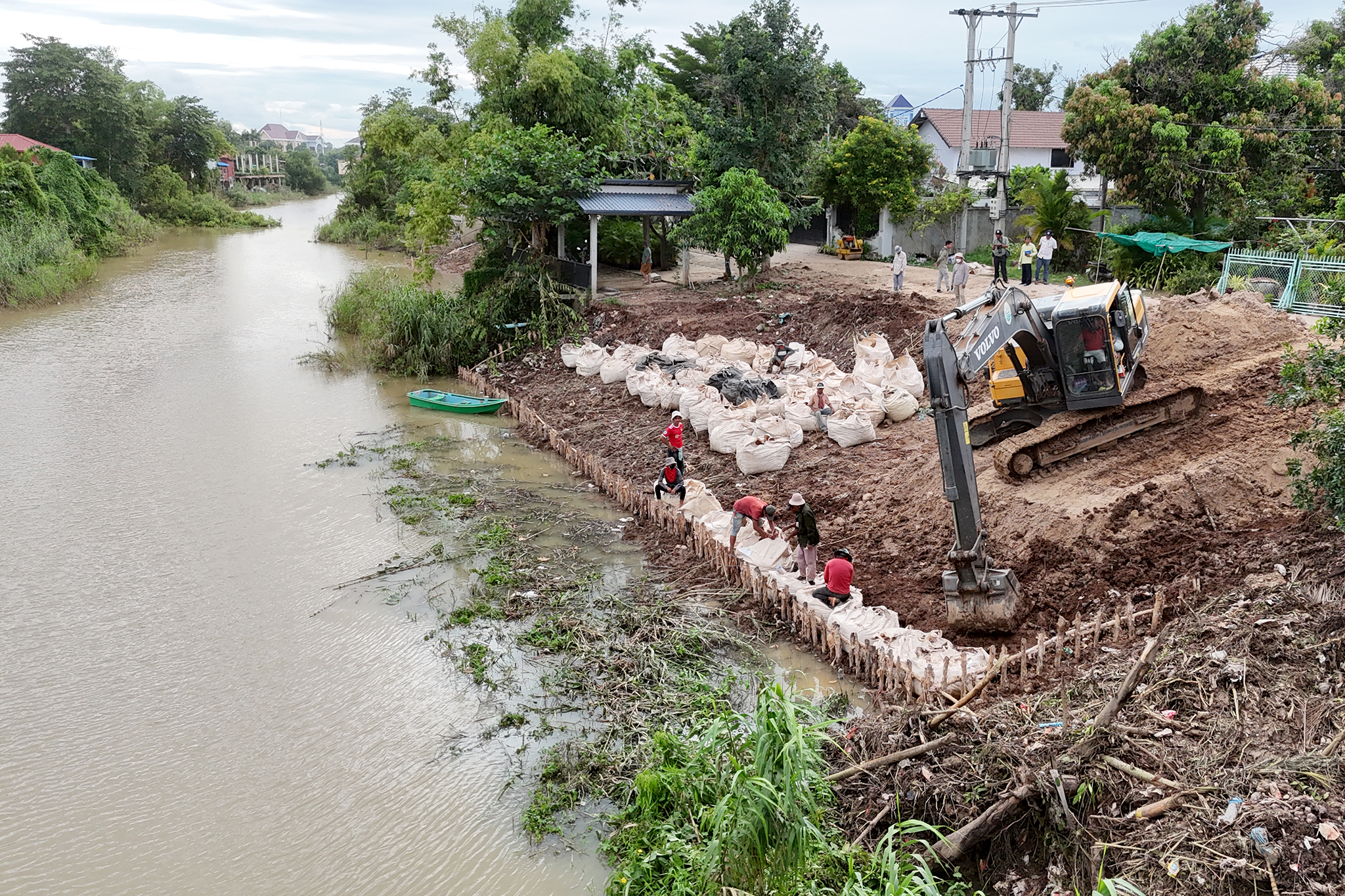 លោក ផាង វី ប្រធាននាយកដ្ឋានធារាសាស្ដ្រកសិកម្ម បញ្ជាក់ឱ្យដឹងថា នៅជំហានដំបូងនេះក្រសួងបានបញ្ជូនគ្រឿងចក្រដែលរួមមាន អេស្កាវាទ័រ ៣គ្រឿង និងរថយន្តបែនចំនួន ៥គ្រឿង សម្រាប់អនុវត្តការងារជួសជុលបន្ទាន់ច្រាំងស្ទឹងដែលបានបាក់ដាច់ចំនួន ៣ទីតាំង ស្ថិតក្នុងភូមិព្រែកតាឡុង សង្កាត់តាក្ដុល ភូមិបត្តាជី១ និងបត្តាជី២ សង្កាត់ព្រែកហូរ ក្រុងតាខ្មៅ ខេត្តកណ្តល ដែលជាលទ្ធផលបានបុកស្មាច់ទប់ជម្រាលជើងទេរបានប្រវែង ២០០ម៉ែត្រ និងរៀបបាវខ្សាច់បានប្រវែង ១០០ម៉ែត្រ។