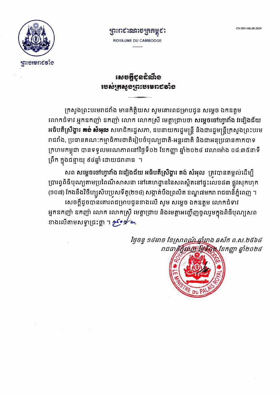 បើយោងតាមសេចក្តីជូនដំណឹងរបស់ ក្រសួងព្រះបរមរាជវាំង សូមជម្រាបជូន សម្តេច ឯកឧត្តម លោកជំទាវ អ្នកឧកញ៉ា ឧកញ៉ា លោក លោកស្រី មេត្តាជ្រាបថា សម្តេចចៅហ្វាវាំង វរវៀងជ័យ អធិបតីស្រឹង្គារ គង់ សំអុល សមាជិករដ្ឋសភា, ឧបនាយករដ្ឋមន្ត្រី និងជារដ្ឋមន្ត្រីក្រសួងព្រះបរម រាជវាំង, ប្រធានគណៈកម្មាធិការជាតិរៀបចំបុណ្យជាតិ-អន្តរជាតិ និងជាអនុប្រធានកាកបាទ ក្រហមកម្ពុជា បានទទួលមរណភាពនៅថ្ងៃទី០២ ខែកញ្ញា ឆ្នាំ២០២៤ វេលាម៉ោង ០៨៖៣៥នាទី ព្រឹក ក្នុងជន្មាយុ ៩៤ឆ្នាំ ដោយជរាពាធ ។