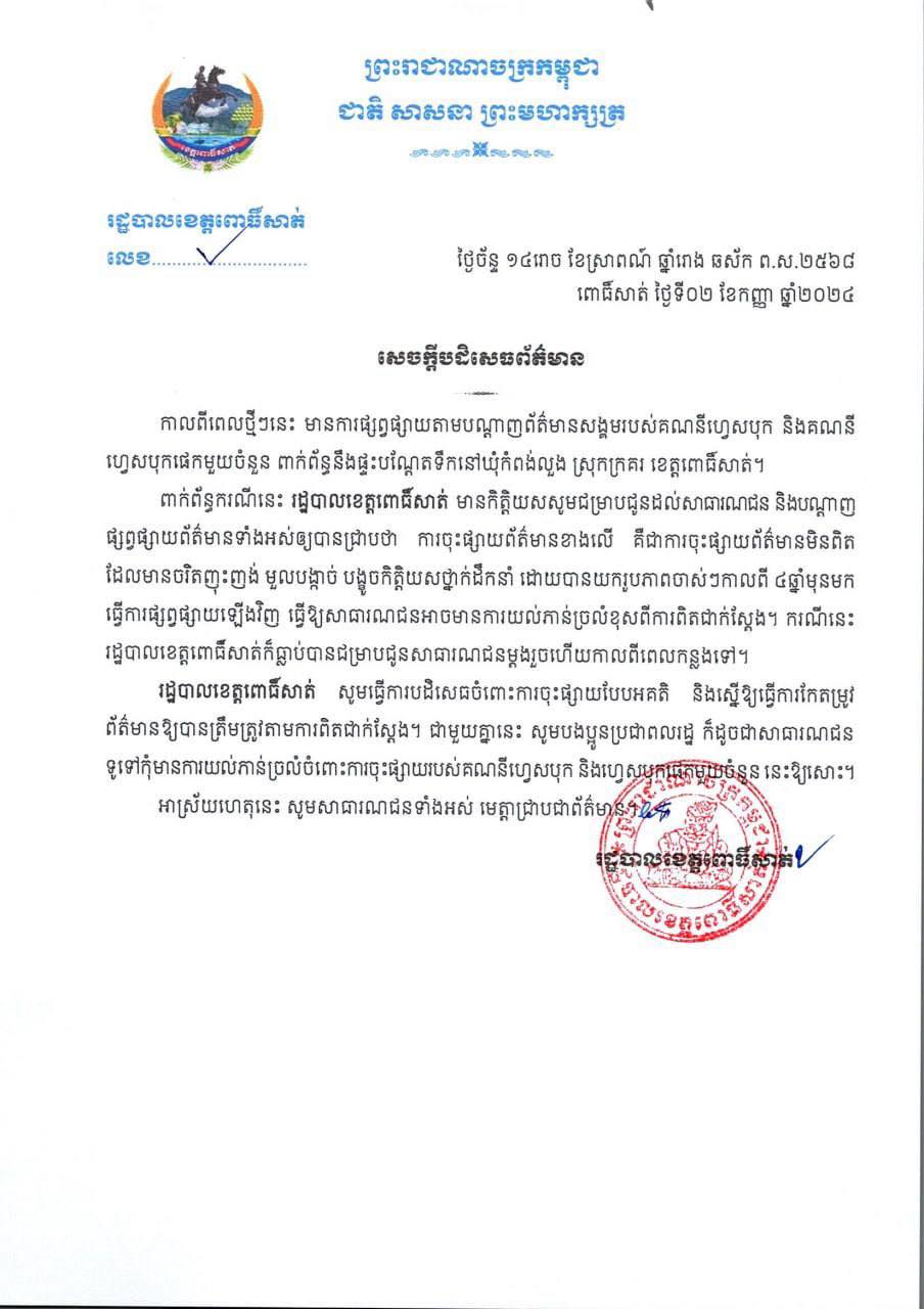 ពាក់ព័ន្ធករណីនេះ រដ្ឋបាលខេត្តពោធិ៍សាត់ មានកិត្តិយសសូមជម្រាបជូនដល់សាធារណជន និងបណ្តាញ ផ្សព្វផ្សាយព័ត៌មានទាំងអស់ឲ្យបានជ្រាបថា ការចុះផ្សាយព័ត៌មានខាងលើ គឺជាការចុះផ្សាយព័ត៌មានមិនពិត ដែលមានចរិតញុះញង់ មូលបង្កាច់ បង្អួចកិត្តិយសថ្នាក់ដឹកនាំ ដោយបានយករូបភាពចាស់ៗកាលពី ៤ឆ្នាំមុនមក ធ្វើការផ្សព្វផ្សាយឡើងវិញ ធ្វើឱ្យសាធារណជនអាចមានការយល់ភាន់ច្រលំខុសពីការពិតជាក់ស្តែង។ ករណីនេះ រដ្ឋបាលខេត្តពោធិ៍សាត់ក៏ធ្លាប់បានជម្រាបជូនសាធារណជនម្តងរួចហើយកាលពីពេលកន្លងទៅ។