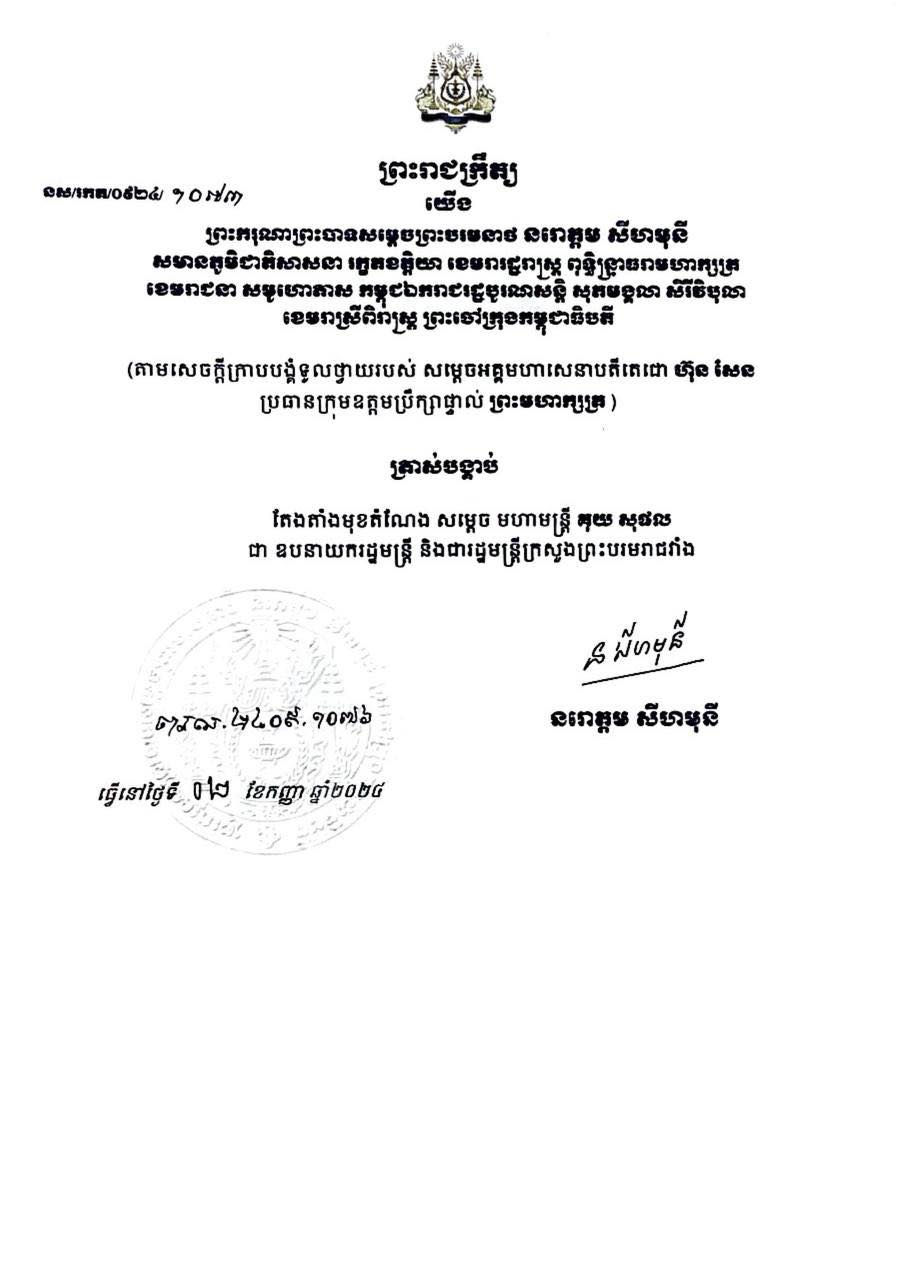 ការត្រាស់បង្គាប់តែងតាំងនេះ ធ្វើឡើងបន្ទាប់ពីមានសំណើក្រាបបង្គំទូលថ្វាយរបស់ សម្តេចតេជោ ហ៊ុន សែន ប្រធានក្រុមឧត្តមប្រឹក្សាផ្ទាល់ព្រះមហាក្សត្រ។