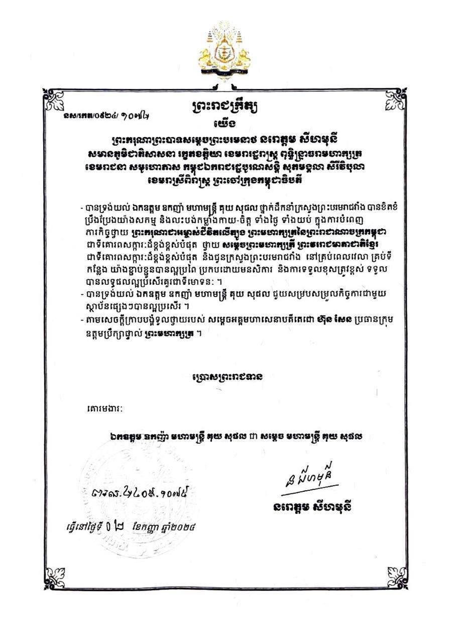 ព្រះមហាក្សត្រ ផ្តល់គោរមងារ ឧកញ៉ា មហាមន្ត្រី គុយ សុផល ជា «សម្តេច» និងតែងតាំងជា «ឧបនាយករដ្ឋមន្ត្រី និងជារដ្ឋមន្ត្រីក្រសួងព្រះបរមរាជវាំង»
