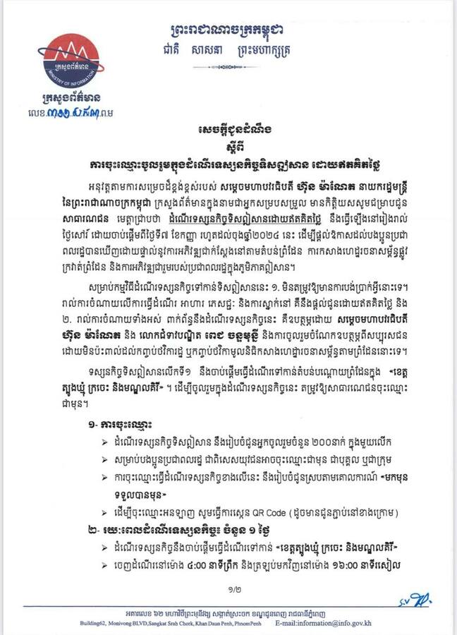 យោងតាមសេចក្តីជូនដំណឹងរបស់ក្រសួងព័ត៌មានបានអោយដឹងថា អនុវត្តតាមការសម្រេចដ៏ខ្ពង់ខ្ពស់របស់ សម្តេចមហាបវរធិបតី ហ៊ុន ម៉ាណែត នាយករដ្ឋមន្ត្រី នៃព្រះរាជាណាចក្រកម្ពុជា ក្រសួងព័ត៌មានក្នុងនាមជាអ្នកសម្របសម្រួល មានកិត្តិយសបានរៀបចំដំណើរទស្សនកិច្ចទិសឦសានដោយឥតគិតថ្លៃ នឹងធ្វើឡើងនៅរៀងរាល់ ថ្ងៃសៅរ៍ ដោយចាប់ផ្តើមពីថ្ងៃទី៧ ខែកញ្ញា រហូតដល់ចុងឆ្នាំ២០២៤ នេះ ដើម្បីផ្តល់ឱកាសដល់បងប្អូនប្រជា ពលរដ្ឋបានឃើញដោយផ្ទាល់នូវការអភិវឌ្ឍជាក់ស្តែងនៅតាមតំបន់ព្រំដែន ការកសាងហេដ្ឋរចនាសម្ព័ន្ធផ្លូវ ក្រវាត់ព្រំដែន និងការអភិវឌ្ឍជារួមរបស់ប្រជាពលរដ្ឋក្នុងភូមិភាគឦសាន។