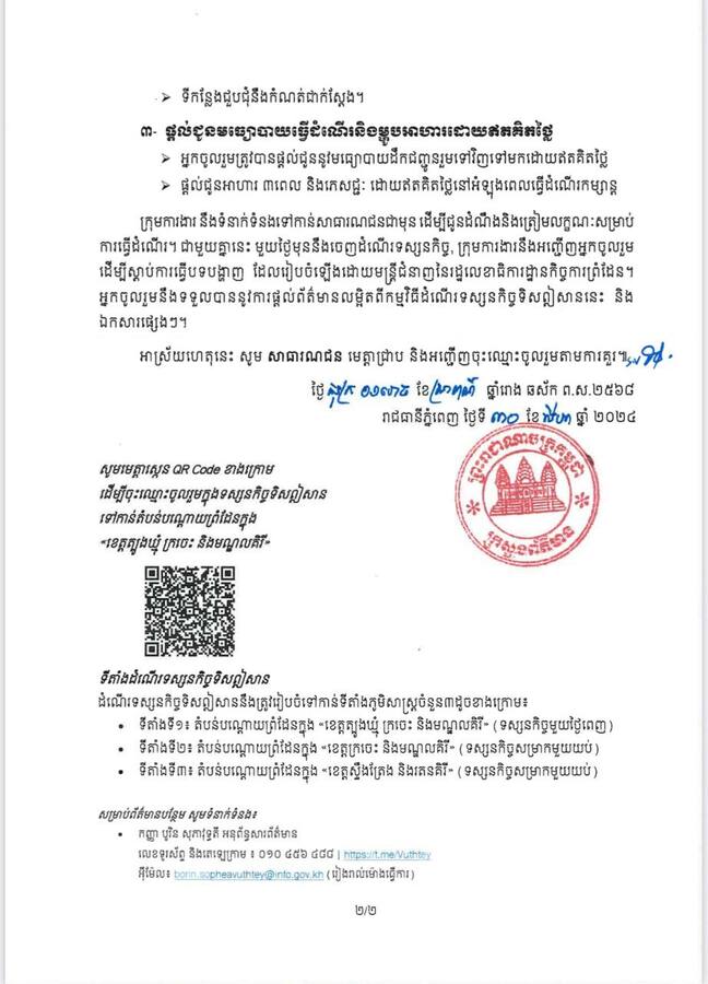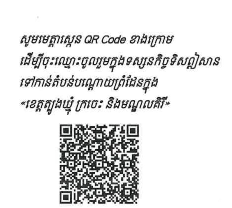 រាជធានីភ្នំពេញ៖ យោងតាមការចុះផ្សាយរបស់ ក្រសួងព័ត៌មាន បានឱ្យដឹងថា ឯកឧត្តម ទេព អស្នារិទ្ធ អនុរដ្ឋលេខាធិការនិងជាអ្នកនាំពាក្យក្រសួងព័ត៌មានបានឲ្យដឹងនៅរសៀលថ្ងៃទី២ ខែកញ្ញានេះថា ប្រជាពលរដ្ឋនិងយុវជនបានផុលផុសចុះឈ្មោះដើម្បី ចូលរួមក្នុងដំណើរទស្សនកិច្ចទិសឦសាន ដោយឥតគិតថ្លៃ ហើយរហូតមកទល់ពេលនេះមានចំនួនជាង ៧០០នាក់ហើយ។ ការចុះឈ្មោះនេះ ធ្វើឡើងតាមរយៈអនឡាញ ដោយស្កេន QR Code ។