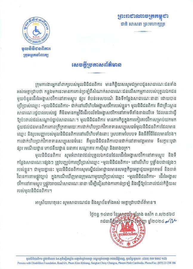 មូលនិធិជនពិការ អំពាវនាវដល់បុគ្គលឯកជនដែលដើររៃថវិកានៅតាមស្ដុប និងទីកន្លែងសាធារណៈ បញ្ឈប់ការប្រើឈ្មោះ «មូលនិធិជនពិការ» នៅលើហិប ឬផ្ទាំងបដា