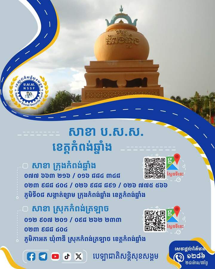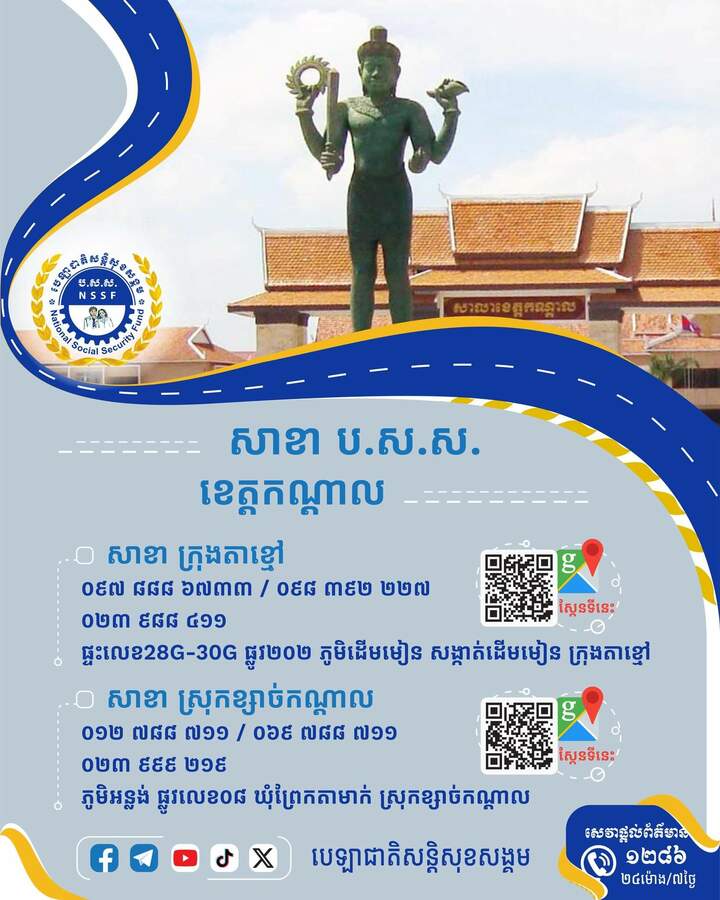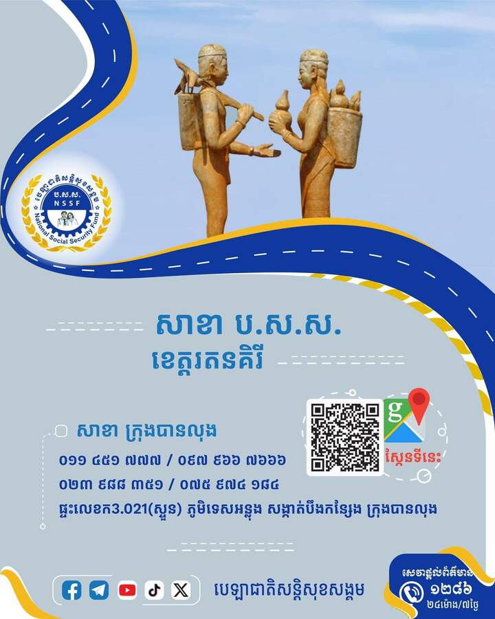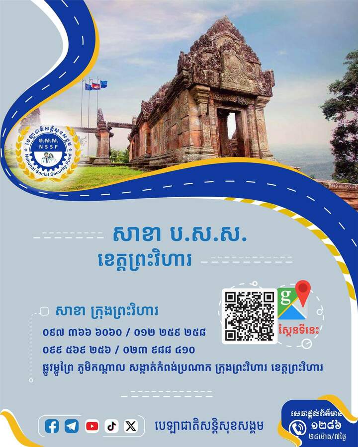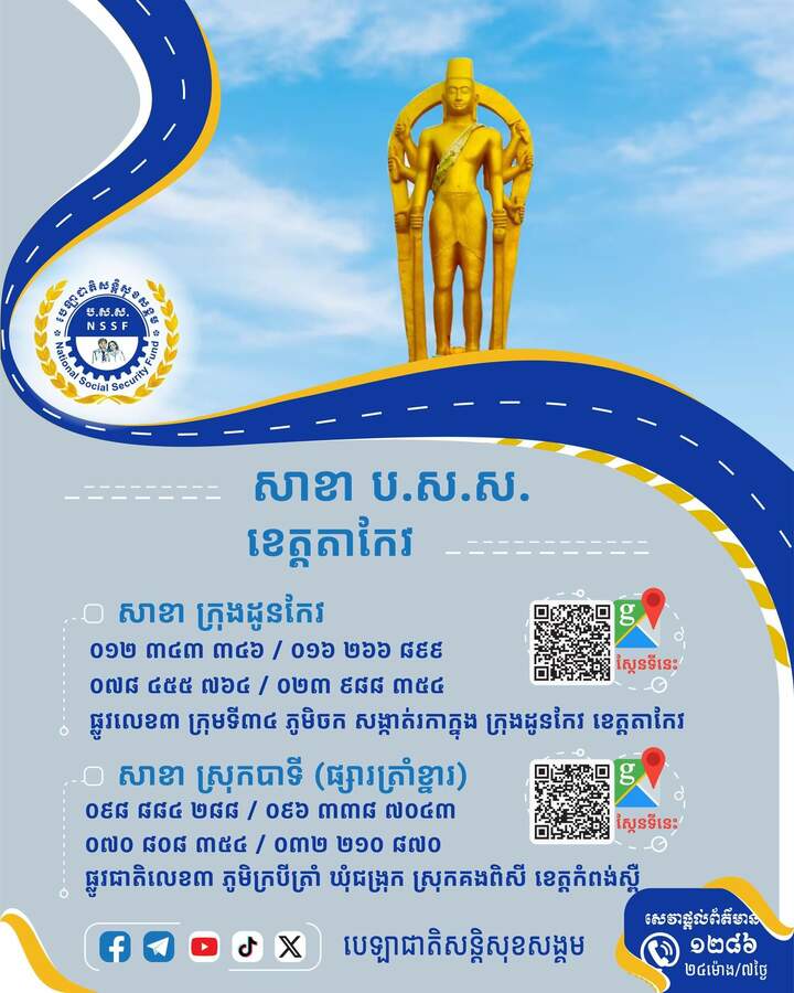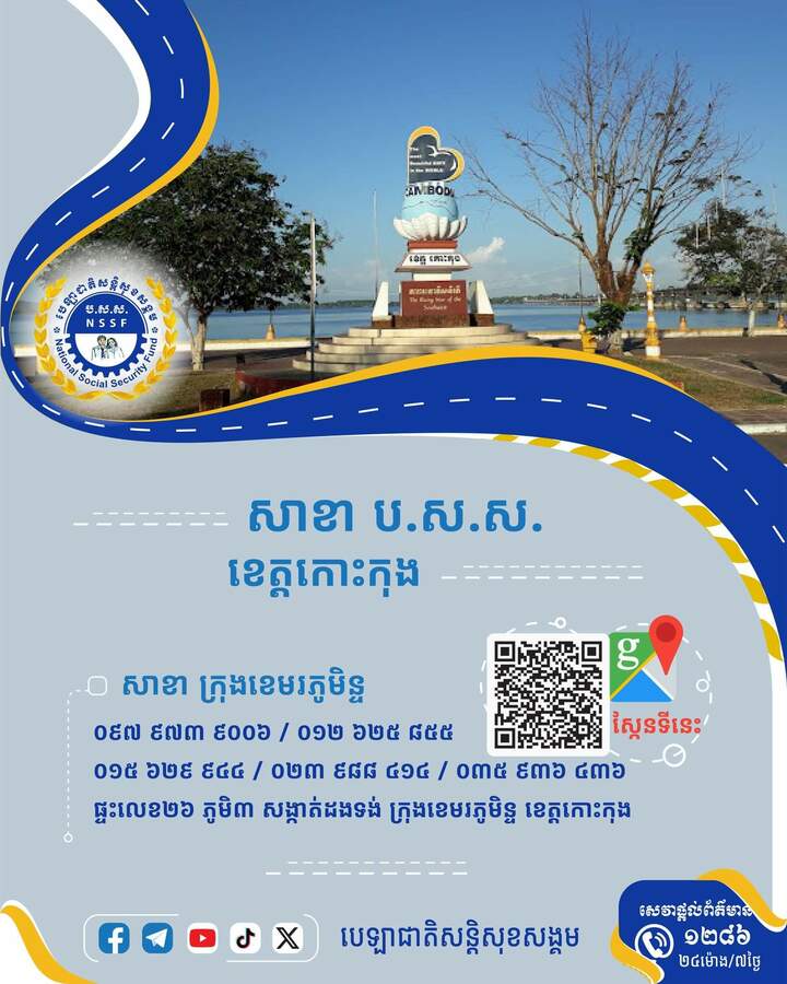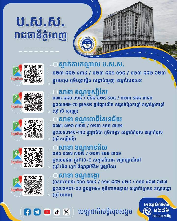 រាជធានីភ្នំពេញ៖ យោងតាមការចុះផ្សាយរបស់ ក្រសួងព័ត៌មាន បានឱ្យដឹងថា ឯកឧត្តម កត្តា អ៊ន រដ្ឋលេខាធិការ និងជាអ្នកនាំពាក្យក្រសួងការងារ និងបណ្តុះបណ្តាលវិជ្ជាជីវៈនៅថ្ងៃទី ៥ ខែកញ្ញា ឆ្នាំ២០២៤ នេះបានលើកឡើងថា បេឡាជាតិសន្តិសុខសង្គម(ប.ស.ស.) នៃក្រសួងការងារ និងបណ្តុះបណ្តាលវិជ្ជាជីវៈបានពង្រីកស្នាក់ការកណ្តាល និងសាខារបស់ខ្លួនបានចំនួន ៣៦ទីតាំងហើយនៅទូទាំងប្រទេសសម្រាប់ប្រតិបត្តិការងារ និងបម្រើសេវាកម្មជូនដល់សាធារណជន។