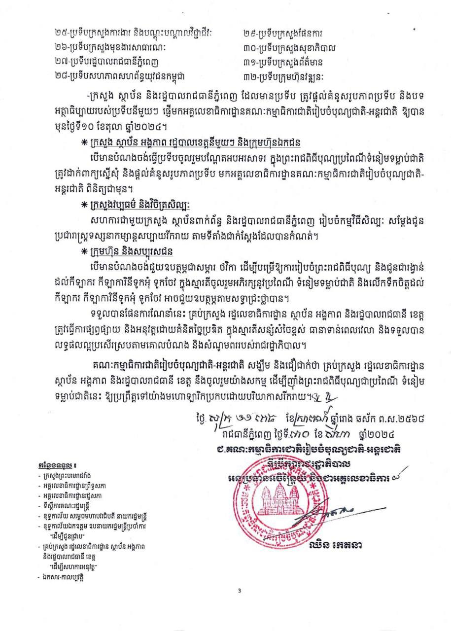 ខាងក្រោមនេះជាចេញសេចក្ដីណែនាំរបស់គណៈកម្មាធិការជាតិរៀបចំបុណ្យជាតិ-អន្ដរជាតិ៖