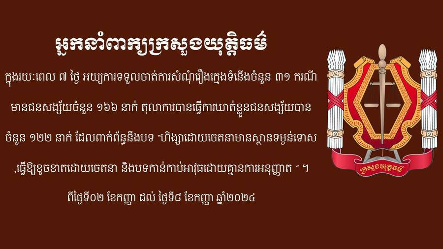 រាជធានីភ្នំពេញ៖ យោងតាមការចុះផ្សាយរបស់ ក្រសួងព័ត៌មាន បានឱ្យដឹងថា ឯកឧត្តម ជិន ម៉ាលីន រដ្ឋលេខាធិការប្រចាំការ និងជាអ្នកនាំពាក្យក្រសួងយុត្តិធម៌ បានគូសបញ្ជាក់តាមបណ្តេញសង្គមតេឡេក្រាម នៅថ្ងៃទី០៩ ខែកញ្ញា ឆ្នាំ២០២៤នេះថា ក្នុងរយៈពេល ៧ថ្ងៃ ពីថ្ងៃទី០២ ខែកញ្ញា ដល់ថ្ងៃទី០៨ ខែកញ្ញា ឆ្នាំ២០២៤ សាលាដំបូង និងអយ្យការអម សាលាដំបូងរាជធានីខេត្ត បានទទួលចាត់ការលើសំណុំរឿងករណីក្មេងទំនើងចំនួន ៣១ ករណី មានជនសង្ស័យចំនួន ១៦៦ នាក់ តុលាការបានធ្វើការឃាត់ខ្លួនជនសង្ស័យបាន ចំនួន ១២២ នាក់ ដែលពាក់ព័ន្ធនឹងបទ ហិង្សាដោយចេតនាមានស្ថានទម្ងន់ទោស ធ្វើឱ្យខូចខាតដោយចេតនា លួចមានស្ថានទម្ងន់ទោស និងបទកាន់កាប់ ឬដឹកជញ្ជូនអាវុធដោយគ្មានការអនុញ្ញាត។