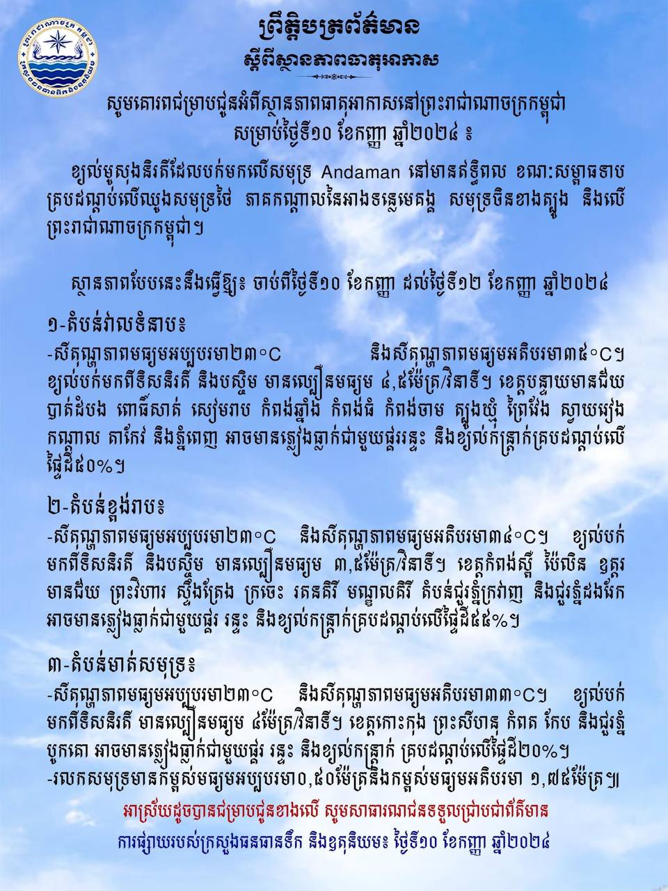 ក្រសួងធនធានទឹក បានឱ្យដឹងថា ខ្យល់មូសុងនិរតីដែលបក់មកលើសមុទ្រ Andaman នៅមានឥទ្ធិពល ខណៈសម្ពាធទាបគ្របដណ្ដប់លើឈូងសមុទ្រថៃ ភាគកណ្តាលនៃអាងទន្លេមេគង្គ សមុទ្រចិនខាងត្បូង និងលើ ព្រះរាជាណាចក្រកម្ពុជា។ ស្ថានភាពបែបនេះនឹងធ្វើឱ្យចាប់ពីថ្ងៃទី១០ ដល់ថ្ងៃទី១២ ខែកញ្ញា ឆ្នាំ២០២៤៖