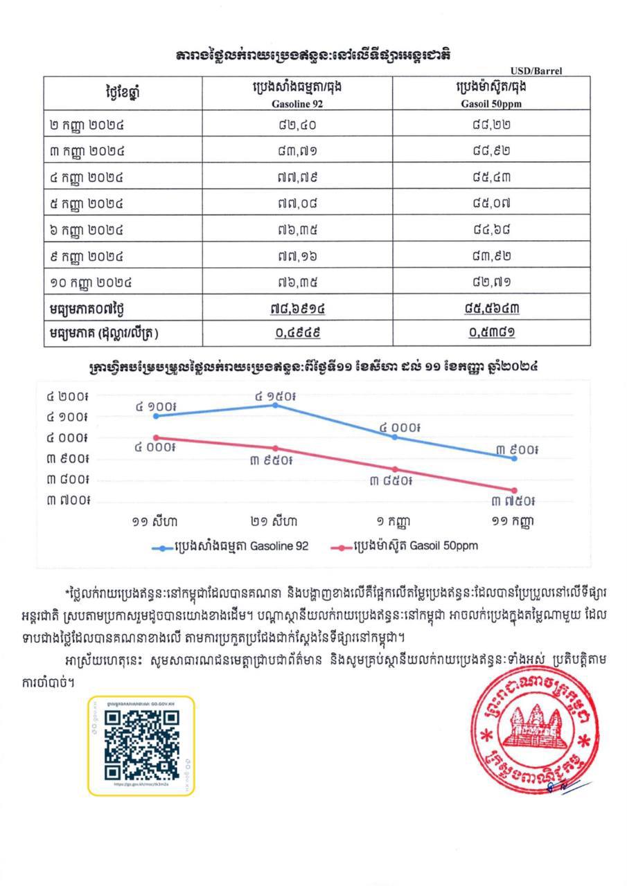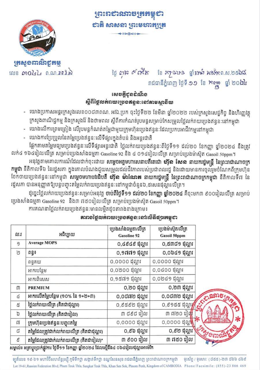 រាជធានីភ្នំពេញ៖ នៅថ្ងៃទី១១ ខែកញ្ញា ឆ្នាំ២០២៤ យោងតាមការចុះផ្សាយរបស់ ក្រសួងពាណិជ្ជកម្ម បានចេញសេចក្តីជូនដំណឹង ប្រកាសពីតម្លៃលក់រាយប្រេងឥន្ធនៈ នៅតាមស្ថានីយនានាដោយចាប់ពីថ្ងៃទី១១ ដល់ថ្ងៃទី២០ ខែកញ្ញា ឆ្នាំ២០២៤ ត្រូវលក់សាំងធម្មតាតម្លៃ ៣,៩០០រៀល និងម៉ាស៊ូតត្រូវលក់ ៣,៧៥០រៀល ក្នុង១លីត្រ។