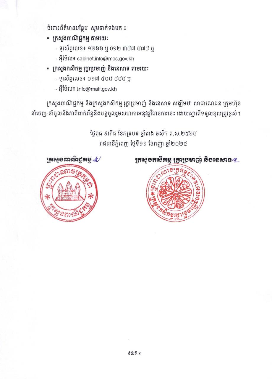 ក្នុងន័យនេះ ក្រសួងពាណិជ្ជកម្ម និងក្រសួងកសិកម្ម សូមជម្រាបជូនថា រាជរដ្ឋាភិបាលកម្ពុជាបានសម្រេចបន្តអនុវត្ត វិធានការហាមឃាត់ការនាំចូលជាបណ្តោះអាសន្នរយៈពេល ០៦ ខែបន្ថែមទៀត ដែលមានសុពលភាព ចាប់ពី ថ្ងៃទី១២ ខែកញ្ញា ឆ្នាំ២០២៤ ដល់ថ្ងៃទី១២ ខែមីនា ឆ្នាំ២០២៥ លើមុខទំនិញដូចខាងក្រោម៖
