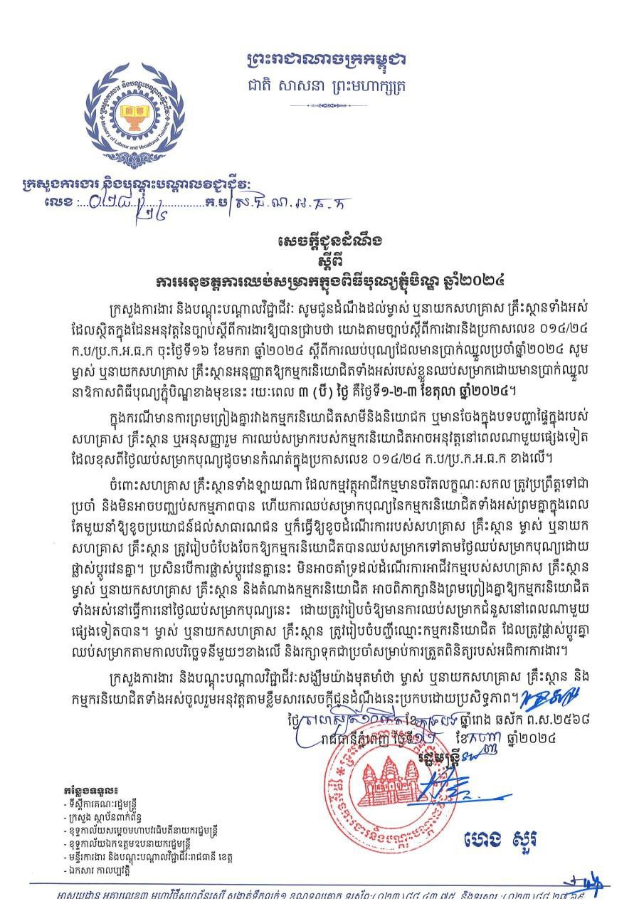 ក្រសួងការងារ និងបណ្តុះបណ្តាលវិជ្ជាជីវៈ សូមជូនដំណឹងដល់ម្ចាស់ ឬនាយកសហគ្រាស គ្រឹះស្ថានទាំងអស់ ដែលស្ថិតក្នុងដែនអនុវត្តនៃច្បាប់ស្តីពីការងារឱ្យបានជ្រាបថា យោងតាមច្បាប់ស្តីពីការងារនិងប្រកាសលេខ ០១៤/២៤ ក.ប/ប្រ.ក.អ.ធ.ក ចុះថ្ងៃទី១៦ ខែមករា ឆ្នាំ២០២៤ ស្តីពីការឈប់បុណ្យដែលមានប្រាក់ឈ្នួលប្រចាំឆ្នាំ២០២៤ សូម ម្ចាស់ ឬនាយកសហគ្រាស គ្រឹះស្ថានអនុញ្ញាតឱ្យកម្មករនិយោជិតទាំងអស់របស់ខ្លួនឈប់សម្រាកដោយមានប្រាក់ឈ្នួល នាឱកាសពិធីបុណ្យភ្ជុំបិណ្ឌខាងមុខនេះ រយៈពេល ៣ (បី) ថ្ងៃ គឺថ្ងៃទី១-២-៣ ខែតុលា ឆ្នាំ២០២៤។