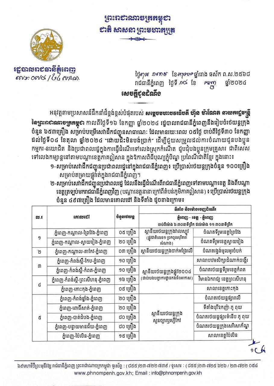 ដោយអនុវត្តតាមប្រសាសន៍ដឹកនាំដ៏ខ្ពង់ខ្ពស់បំផុតរបស់ សម្តេចមហាបវរធិបតី ហ៊ុន ម៉ាណែត នាយករដ្ឋមន្ត្រី នៃព្រះរាជាណាចក្រកម្ពុជា កាលពីថ្ងៃទី១៦ ខែកញ្ញា ឆ្នាំ២០២៤ រដ្ឋបាលរាជធានីភ្នំពេញនឹងរៀបចំរថយន្តក្រុង ចំនួន ៦៥៣គ្រឿង សម្រាប់បម្រើសេវាដឹកជញ្ជូនសាធារណៈ ដែលមានរយៈពេល ០៥ថ្ងៃ ចាប់ពីថ្ងៃទី៣០ ខែកញ្ញា ដល់ថ្ងៃទី០៤ ខែតុលា ឆ្នាំ២០២៤ “ដោយជិះមិនបង់ប្រាក់” ដើម្បីជួយសម្រួលដល់ការចំណាយជូនបងប្អូន កម្មករ-នយោជិត និងប្រជាពលរដ្ឋក្នុងការធ្វើដំណើរទៅលេងស្រុកកំណើត ជួបជុំបងប្អូនក្រុមគ្រួសារ ជាពិសេស ទៅលេងកម្សាន្តនៅតាមបណ្តាខេត្តភាគឦសាន ក្នុងឱកាសពិធីបុណ្យភ្ជុំបិណ្ឌ ប្រពៃណីជាតិខ្មែរ ៕