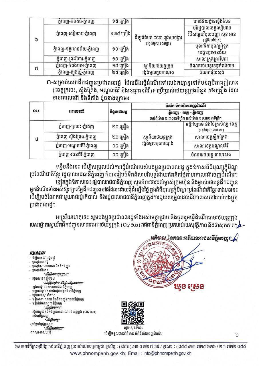 រដ្ឋបាលរាជធានីភ្នំពេញ នឹងរៀបចំរថយន្តក្រុងចំនួន ៦៥៣គ្រឿង សម្រាប់បម្រើសេវាដឹកជញ្ជូនសាធារណៈជិះដោយមិនបង់ប្រាក់ រយៈពេល ៥ថ្ងៃ